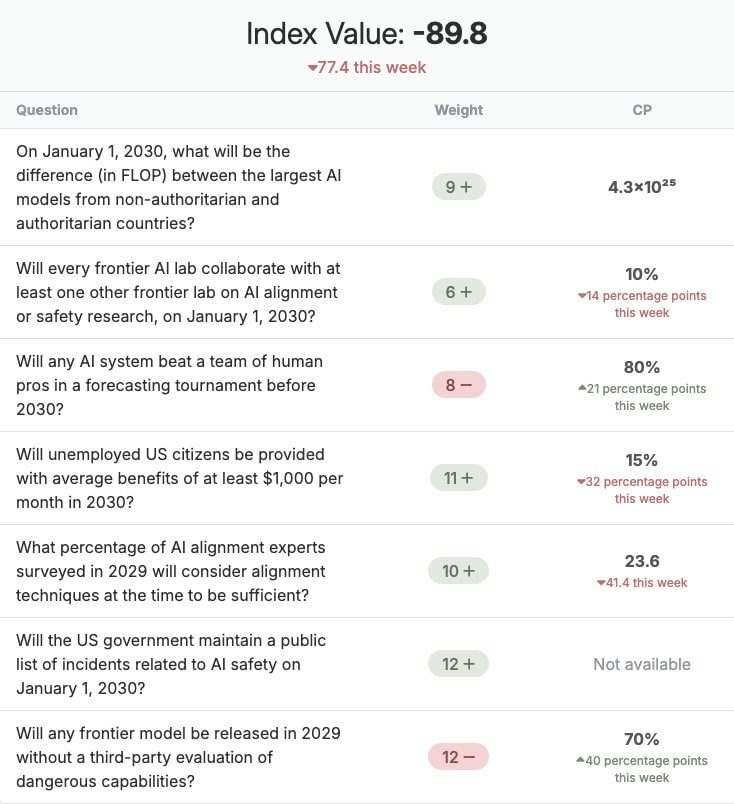 Molly Hickman presents the ‘AGI readiness index’ on a scale from -100 to +100, assembled from various questions on Metaculus, averaging various predictions about what would happen if AGI arrived in 2030. Most top AI labs predict it will be quicker.