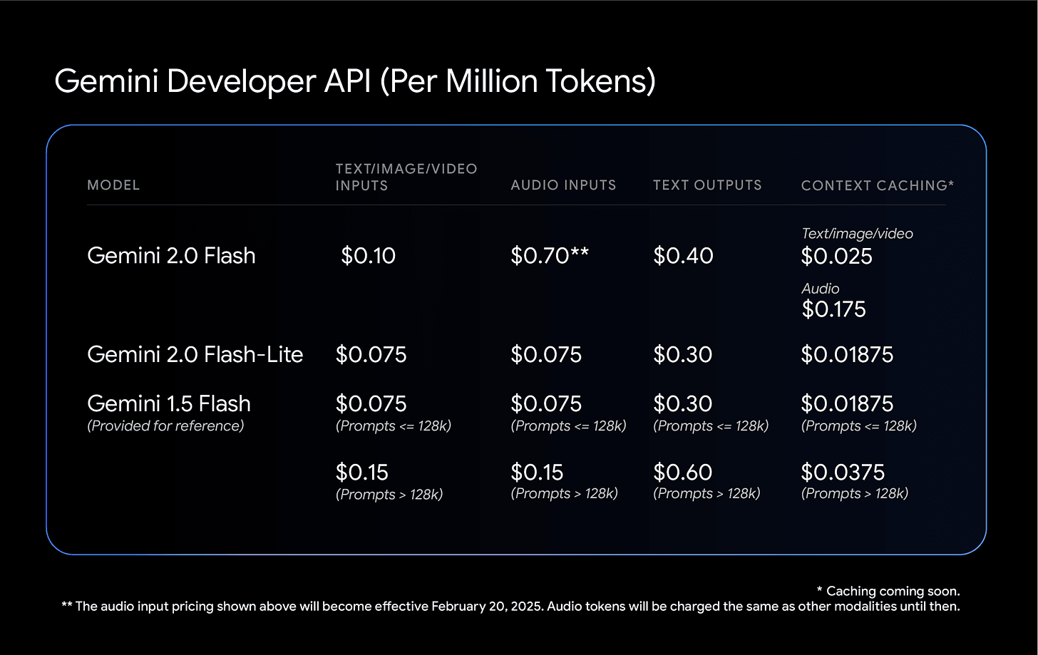 Gemini 2.0 Flash, 2.0 Flash-Lite and 2.0 Pro are now fully available to developers. Flash 2.0 is priced at $0.10/$0.40 per million.