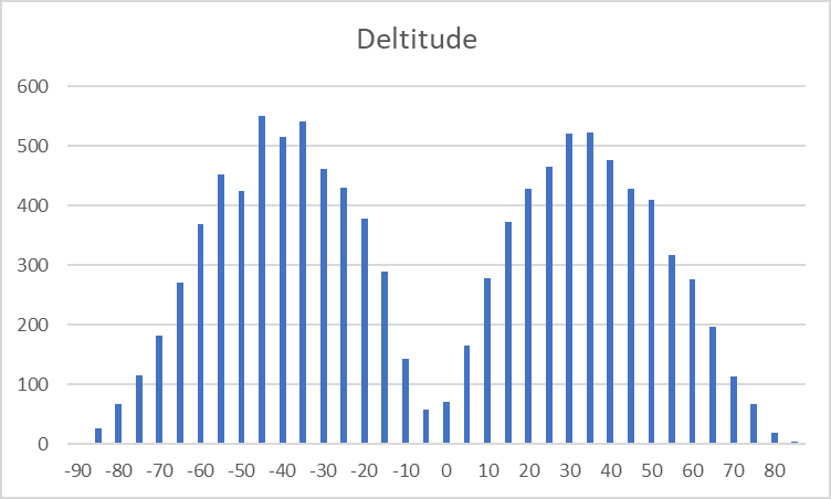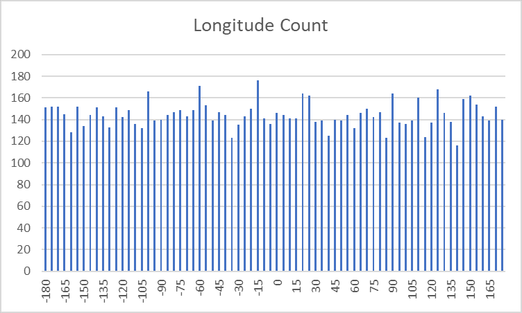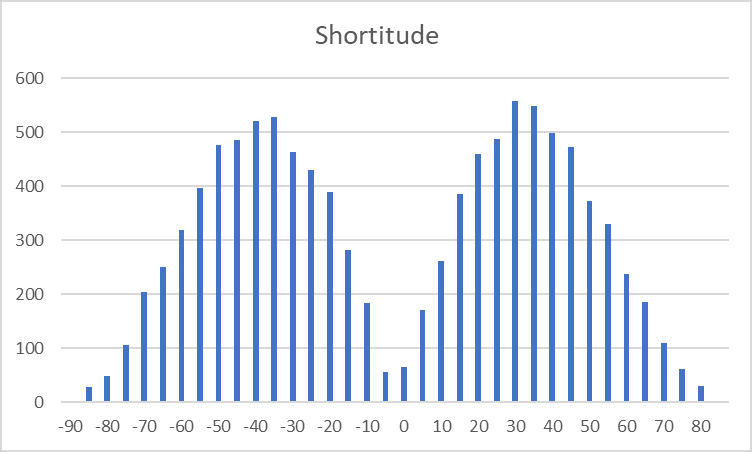 Latitude can vary from -90 to +90 but is bimodal, usually taking on values around 45 - we rarely land near the equator or near the poles.