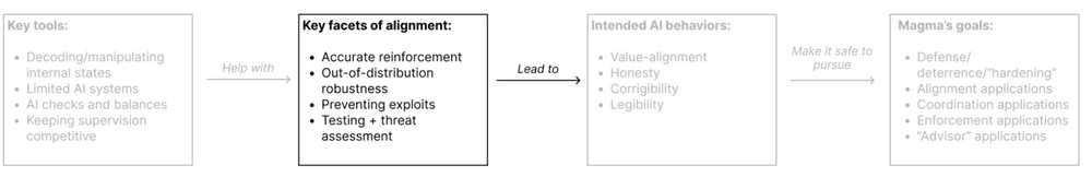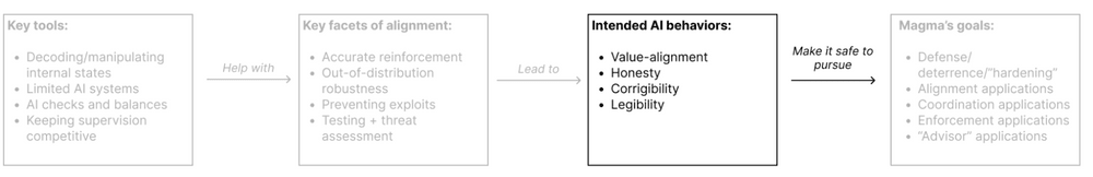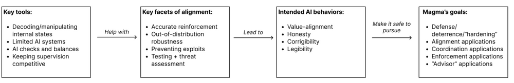 “AI checks and balances” is a major component of how Magma might accomplish this - ensuring that its most advanced systems essentially serve as each others’ supervisors. Other methods could include things like task decomposition (noted above), or finding ways to directly transfer advanced AI systems’ knowledge of the world to humans (via getting AIs to “teach” humans or via decoding AI systems’ internal states).