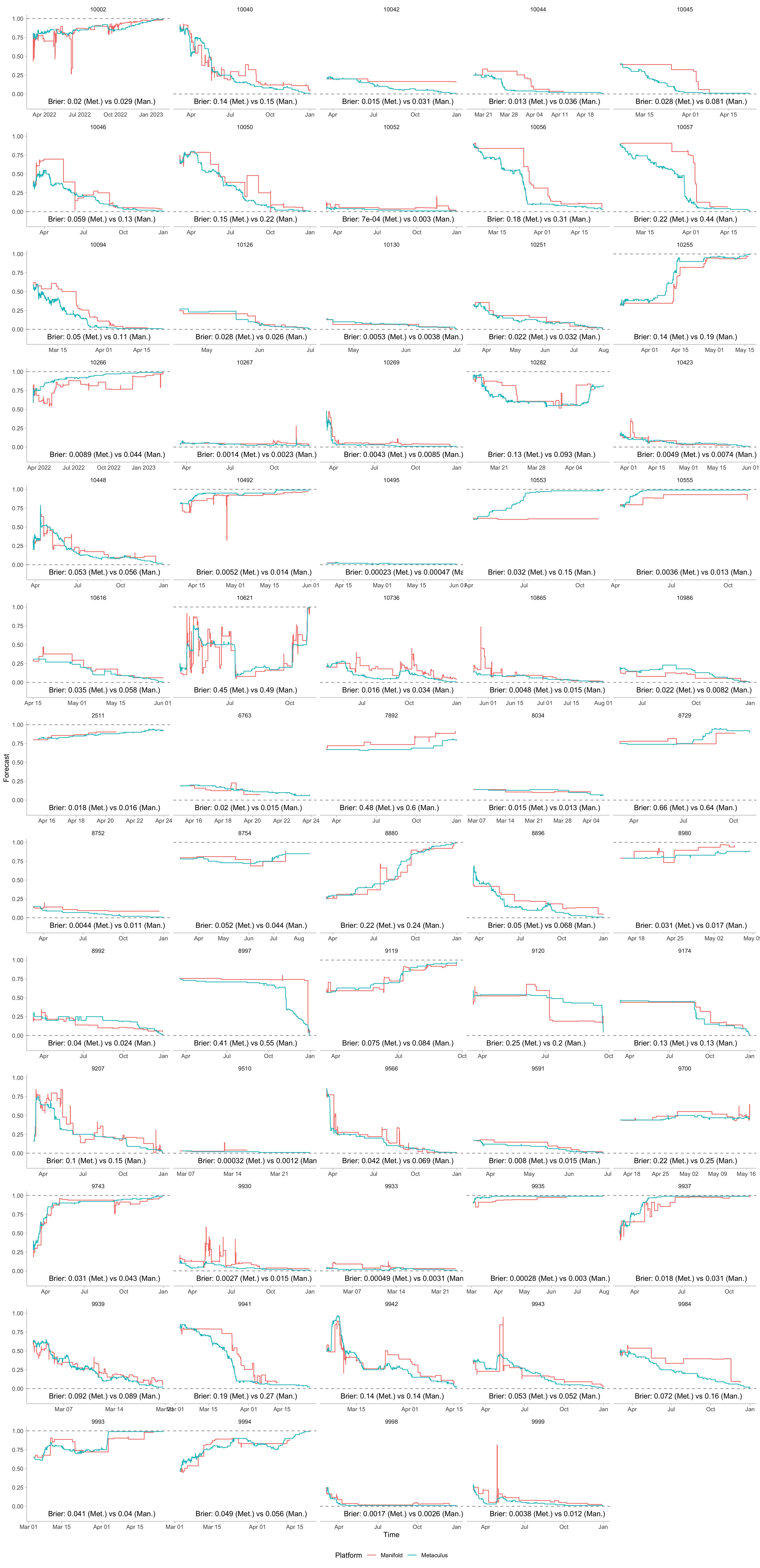 Let's have another look at the actual forecasts. Here is a gigantic plot that shows the corresponding Manifold and Metaculus community prediction (as well as time-averaged scores) for all questions that I looked at.