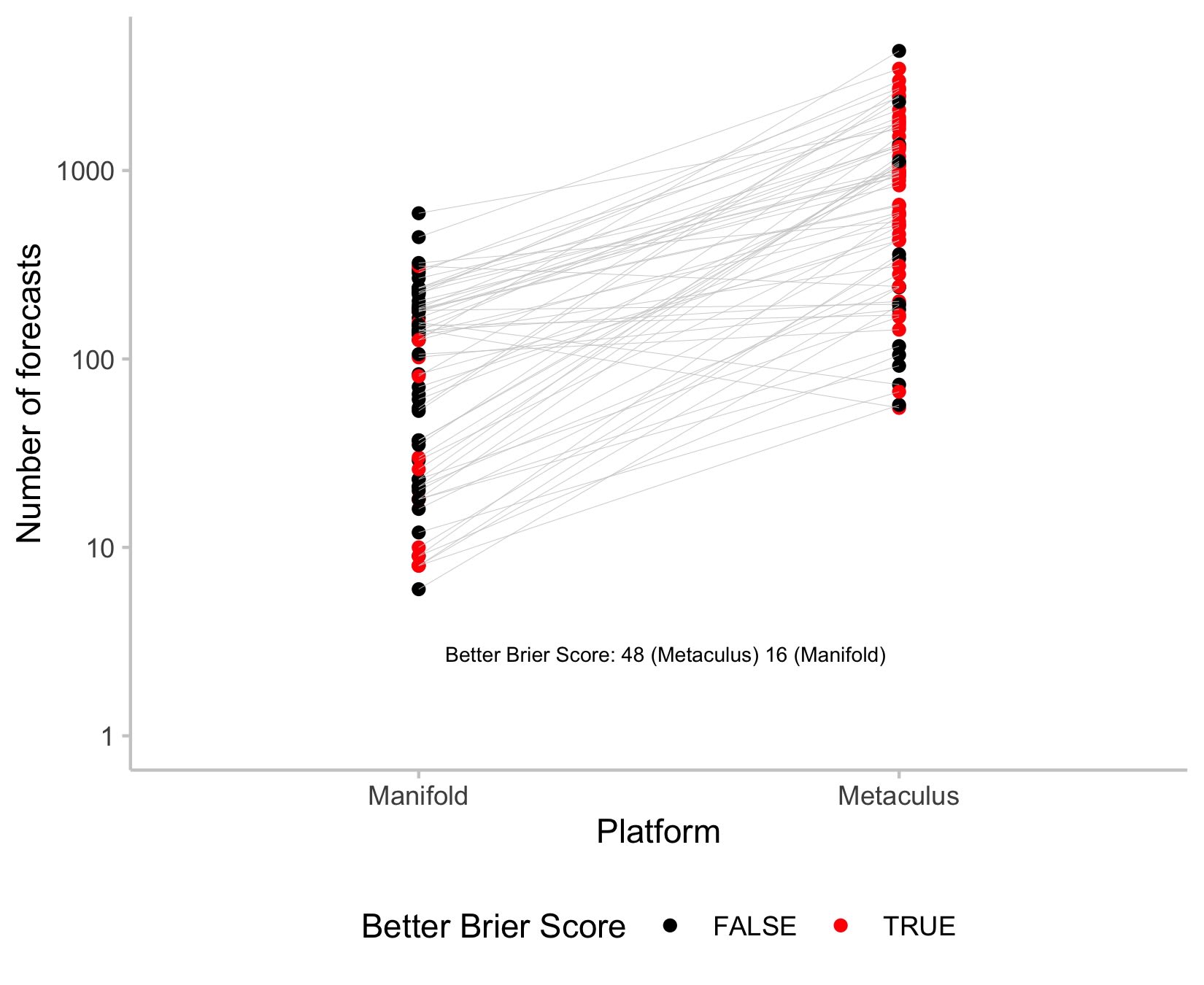 I find this interesting, but also somewhat hard to identify any meaningful patterns. For example, one could expect red points to be clustered at the top for Manifold, indicating that more forecasts equal better performance. But we don't see that here. The comparison may be somewhat limited anyway: In the eyes of the Metaculus community prediction, all forecasts are created equal. On Manifold, however, users can invest different amounts of money. A single user can therefore in principle have an outsized influence on the overall market price if they are willing to spend enough. I'd be interested to see more on how accuracy on Manifold changes with the number of traders and overall trading volume. Who knows, maybe Manifold would be ahead if they had a similar number of forecasters to Metaculus?