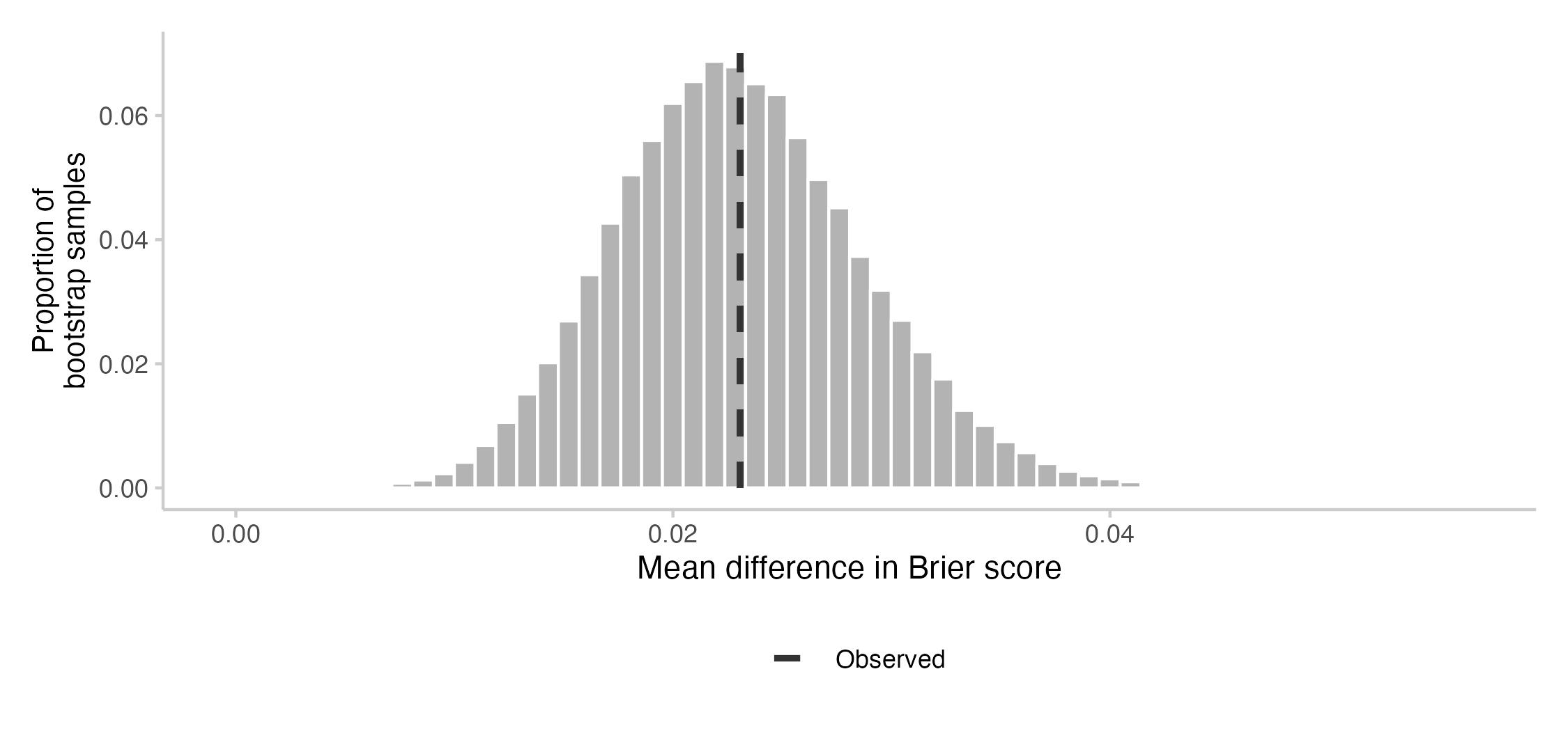Here is a plot with the observed differences in time-averaged Brier scores for every question: