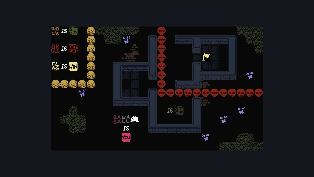 Baba Is You is the purest example of this and it will make your brain hurt in new and exciting ways. The laws of physics are represented by blocks spelling out sentences: "WALL IS STOP" means walls are solid. But the words are objects in the world that you can push around. Break up the sentence and walls stop being solid. Push the words to spell "WALL IS YOU" and suddenly you're playing as all the walls. Push them to spell "WALL IS WIN" and touching walls beats the level.