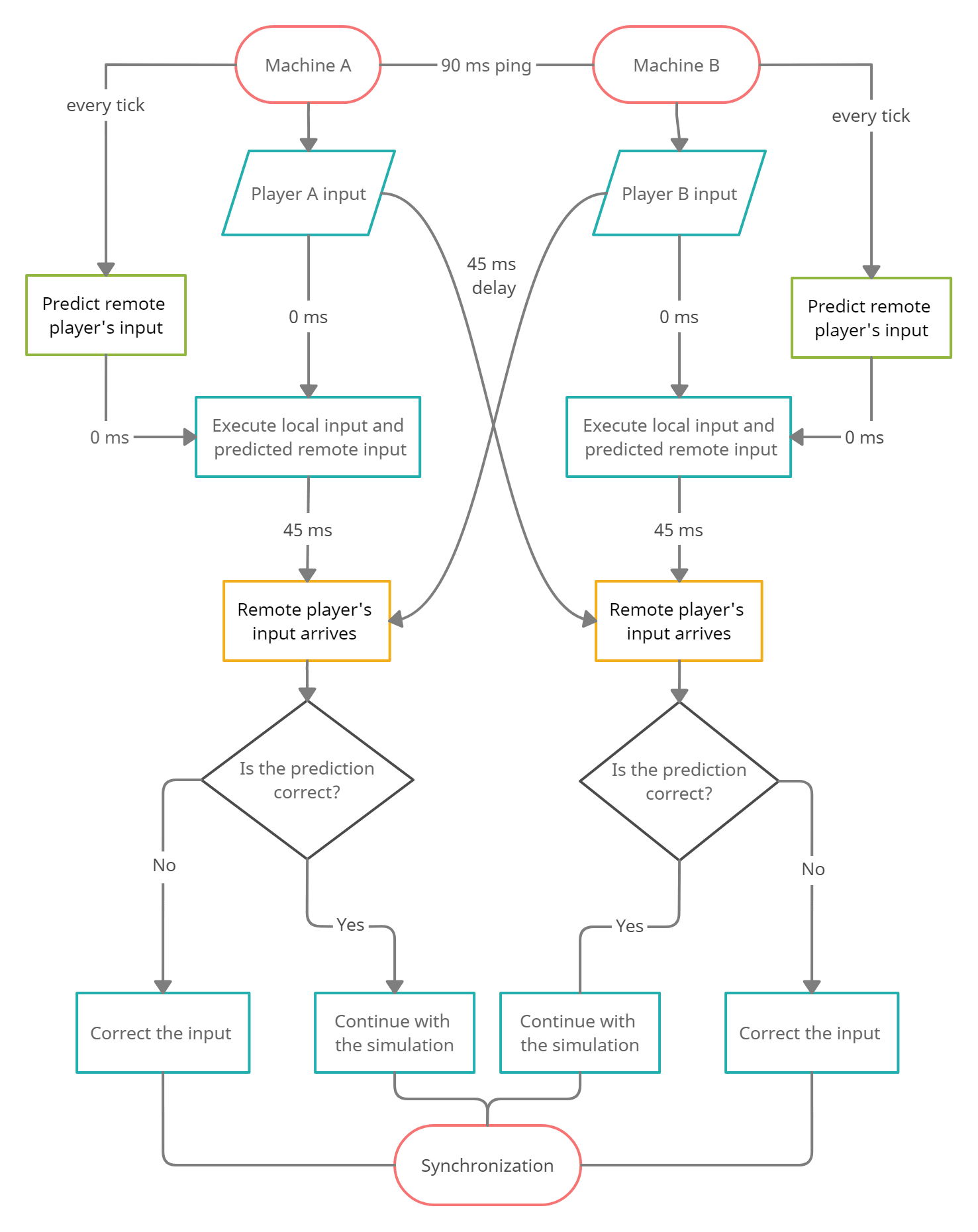 The traditional solution was input delay: the game waits for network confirmation before showing anything happening. This makes the game feel sluggish and unresponsive. You press the punch button, and your character punches 100 milliseconds later.