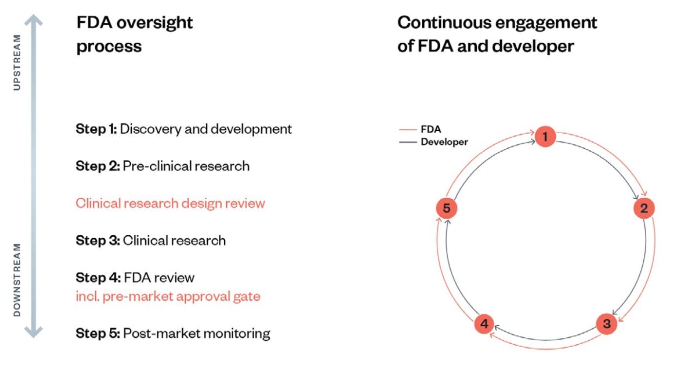 Continuous engagement occurs between the developer and the FDA throughout the development process. The FDA has far-reaching powers to solicit and access information from the developers it oversees, both before and after a product has been put on the market.