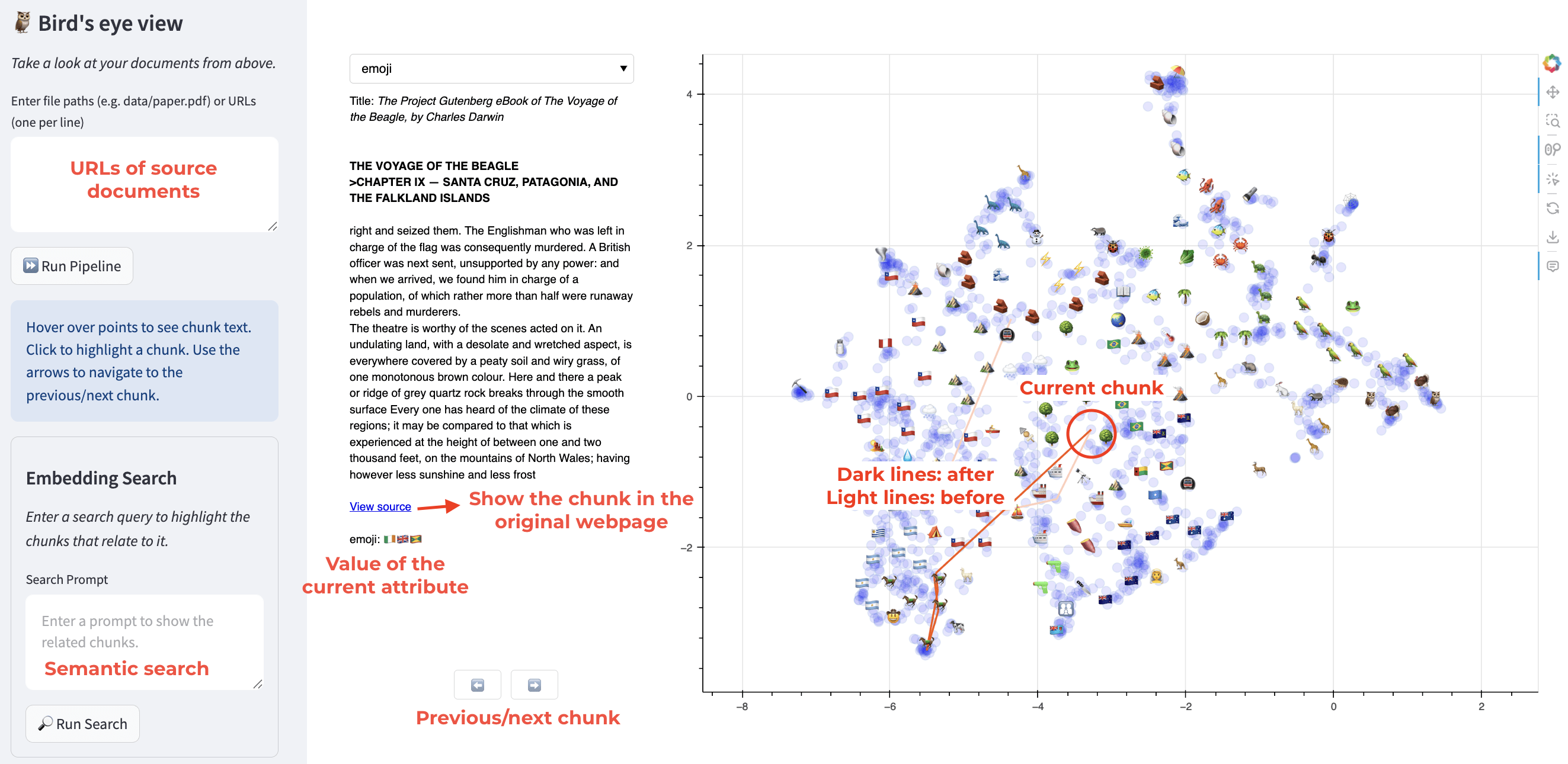 For example, searching for “A paragraph talking about birds” in Darwin’s Voyage clearly highlights regions discussing geese, raptors, and hummingbirds, even when these specific words aren’t mentioned.