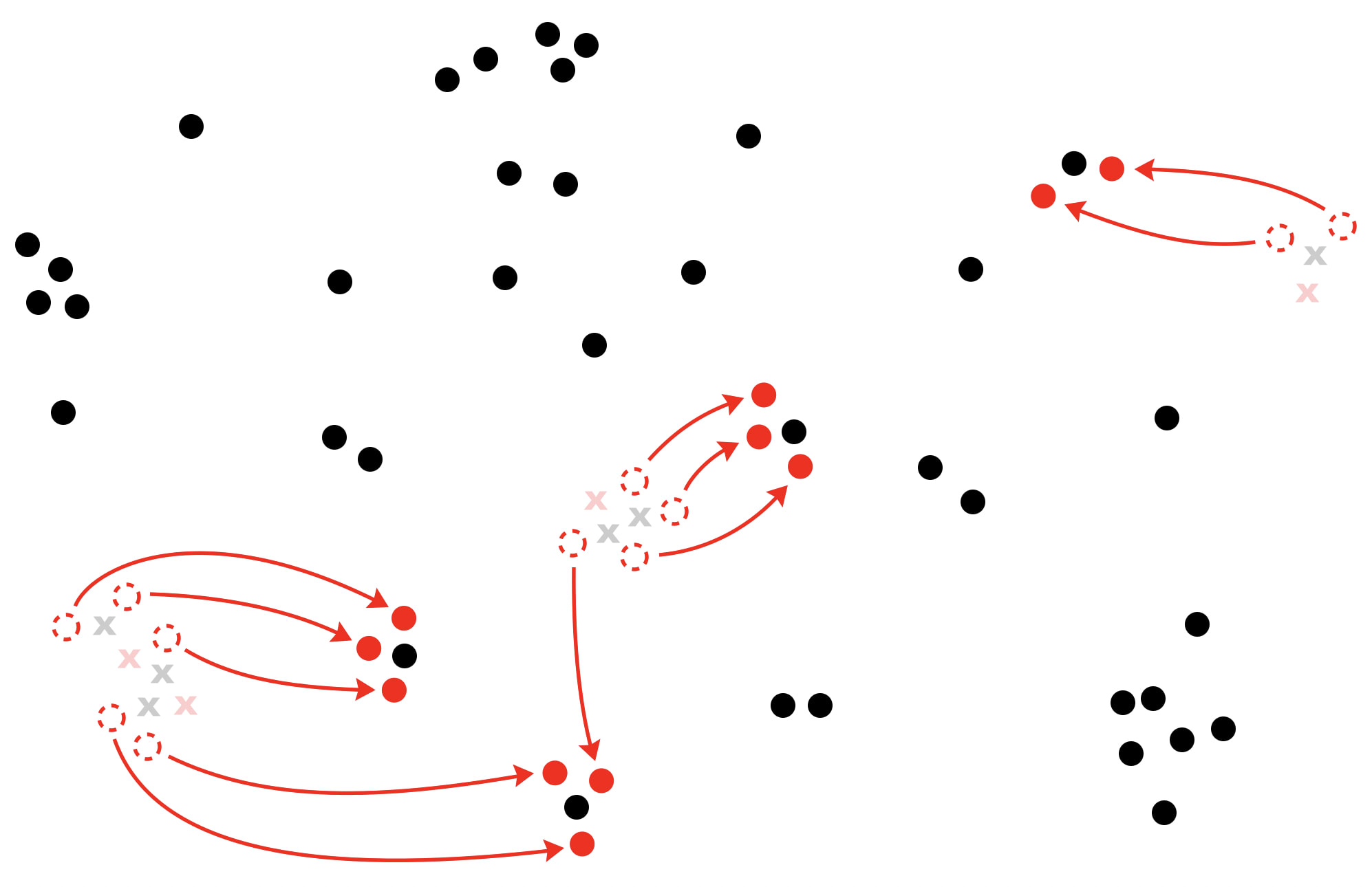 Of course, in a literal military conflict, even victories of concentrated force come with a cost. Troops die or are injured, and are not easily replaced. Ammunition is spent. Equipment breaks down or is destroyed. In the original diagram at the top of this essay, the balance of power was 43(B) : 15(R). If red were to successfully take out the six surrounded black units, at the cost of (say) four of its own, the new balance would be 37(B) : 11(R). Iterate a few more times, and even if red continues to be half again or more as effective as black, they'll still nevertheless eventually be unable to muster decisive force in any given engagement.