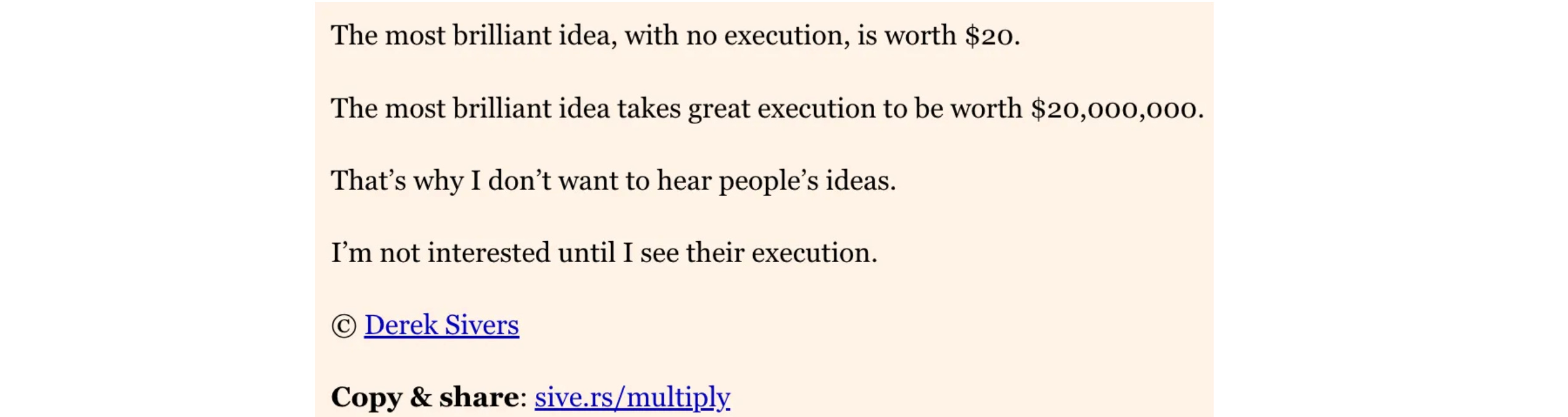 It’s hard to get value out of having an idea if you don’t execute it yourself, but that doesn’t mean it’s not valuable. When people do have a great idea and manage to execute on it, this can make them wildly successful. It’s true execution matters, but if you can do the execution yourself it seems like you clearly can get way more value out of it. We’d probably be in a much better situation if people were able to share ideas more freely without losing this value. Sharing an idea creates a positive externality, and that’s hard to capture.