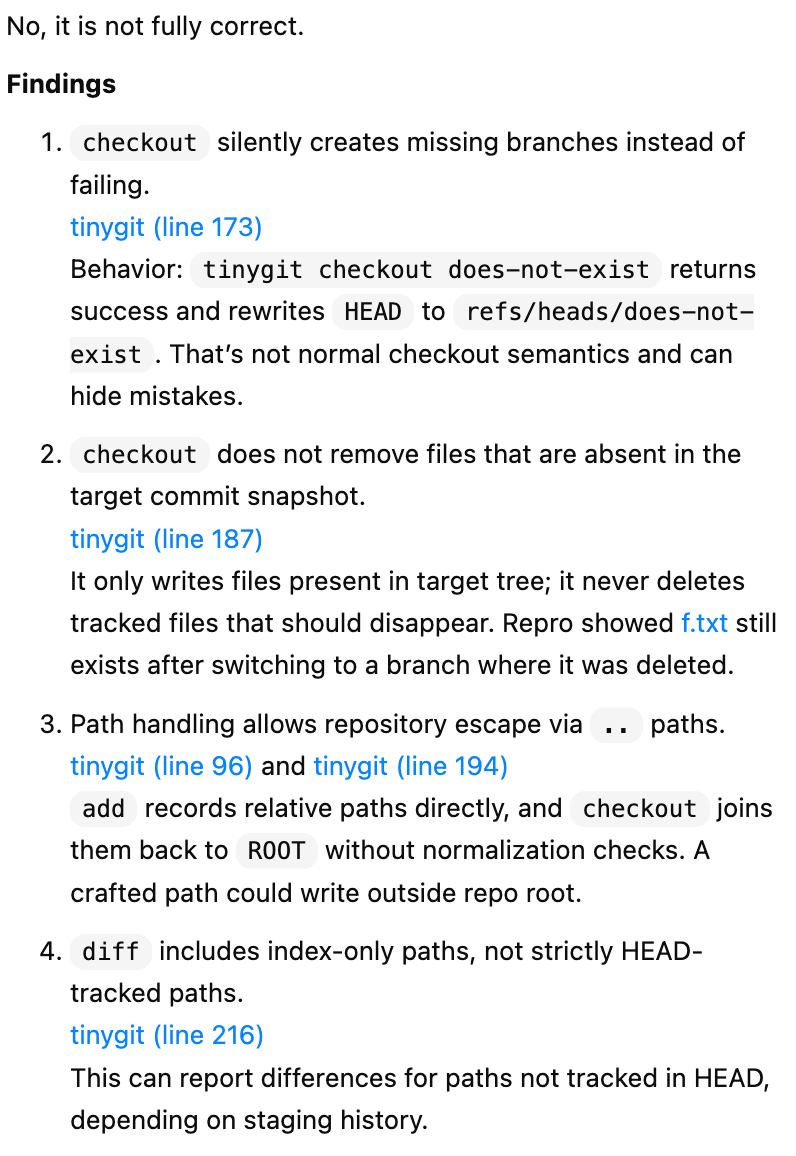 GPT-5 mini’s implementation passed the simple test cases[2] I had codex write, but upon closer inspection…
