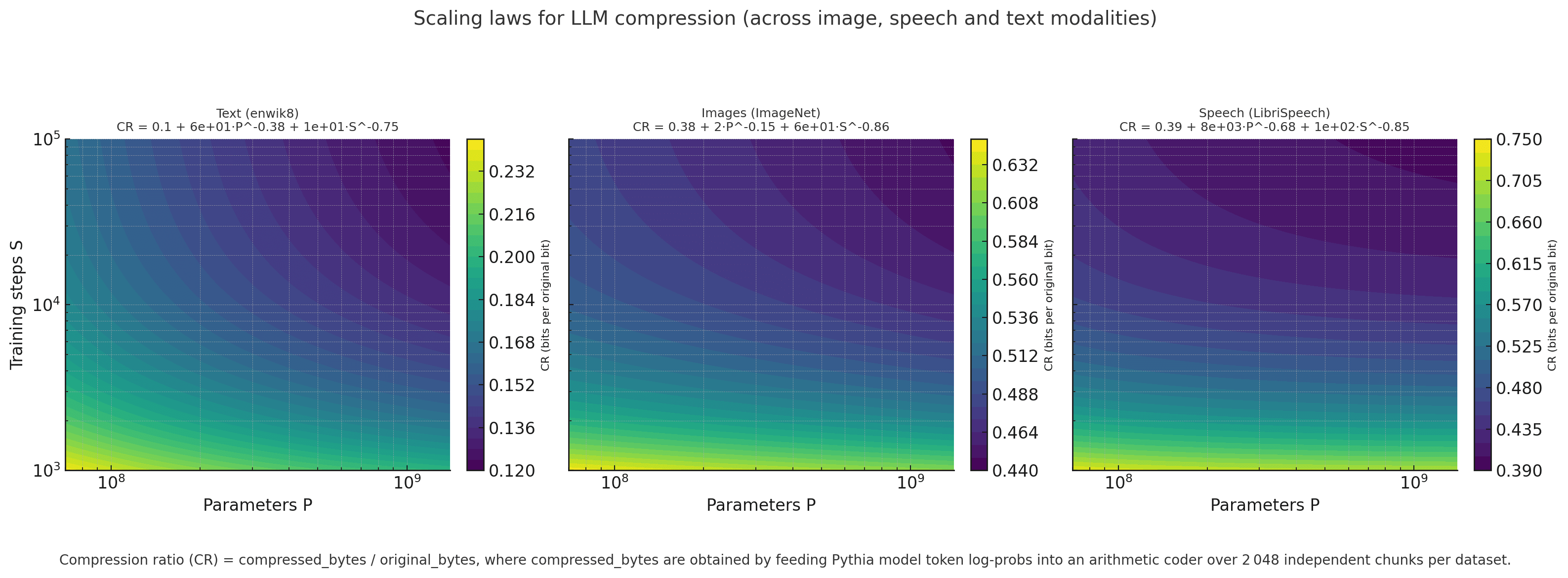 It has been argued that LLMs trained only on text can form world models for proto-AGI. These compression results reinforce that claim: despite text-only pretraining, LLMs compress images and speech following clear power laws.