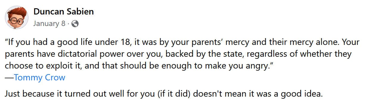 My parents' parenting style is essentially "children are extensions of their parents who must obey and never develop their own personality or opinions." The fact that I've managed to do both of the latter things is again a testament to how hard it is to prevent, but I'm still regularly finding ways in which I have just passively assumed my parents were right about certain things without any evidence, and they in fact were wrong.