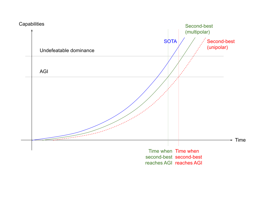 In the scenario where the second-best AI (green solid line in the diagram) achieves AGI before the SOTA achieves undefeatable dominance, the world would end up in a multipolar scenario, where more than one AGI system exists simultaneously. On the other hand, in the scenario where the second-best AI (dotted red line in the diagram) develops at a pace where it is on track to achieve AGI after the SOTA achieves undefeatable dominance, it will in fact never reach AGI, and the world would end up in a unipolar scenario. As an example, in a fast-takeoff world where the SOTA achieves undefeatable dominance <1 year after achieving AGI, while the second-best is constantly lagging behind by more than 1 year, the world would likely end up in a unipolar scenario.