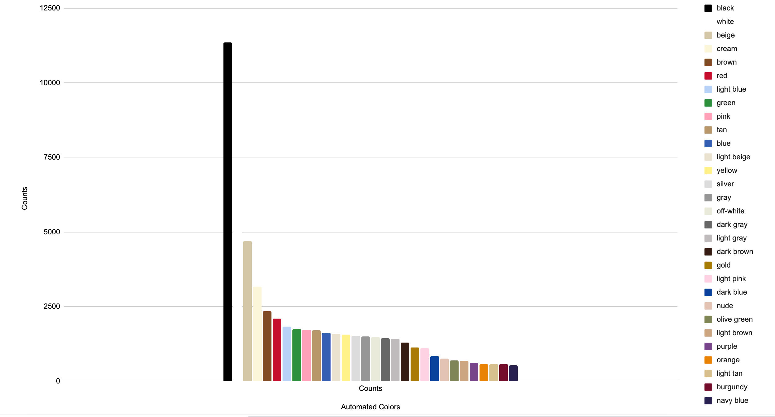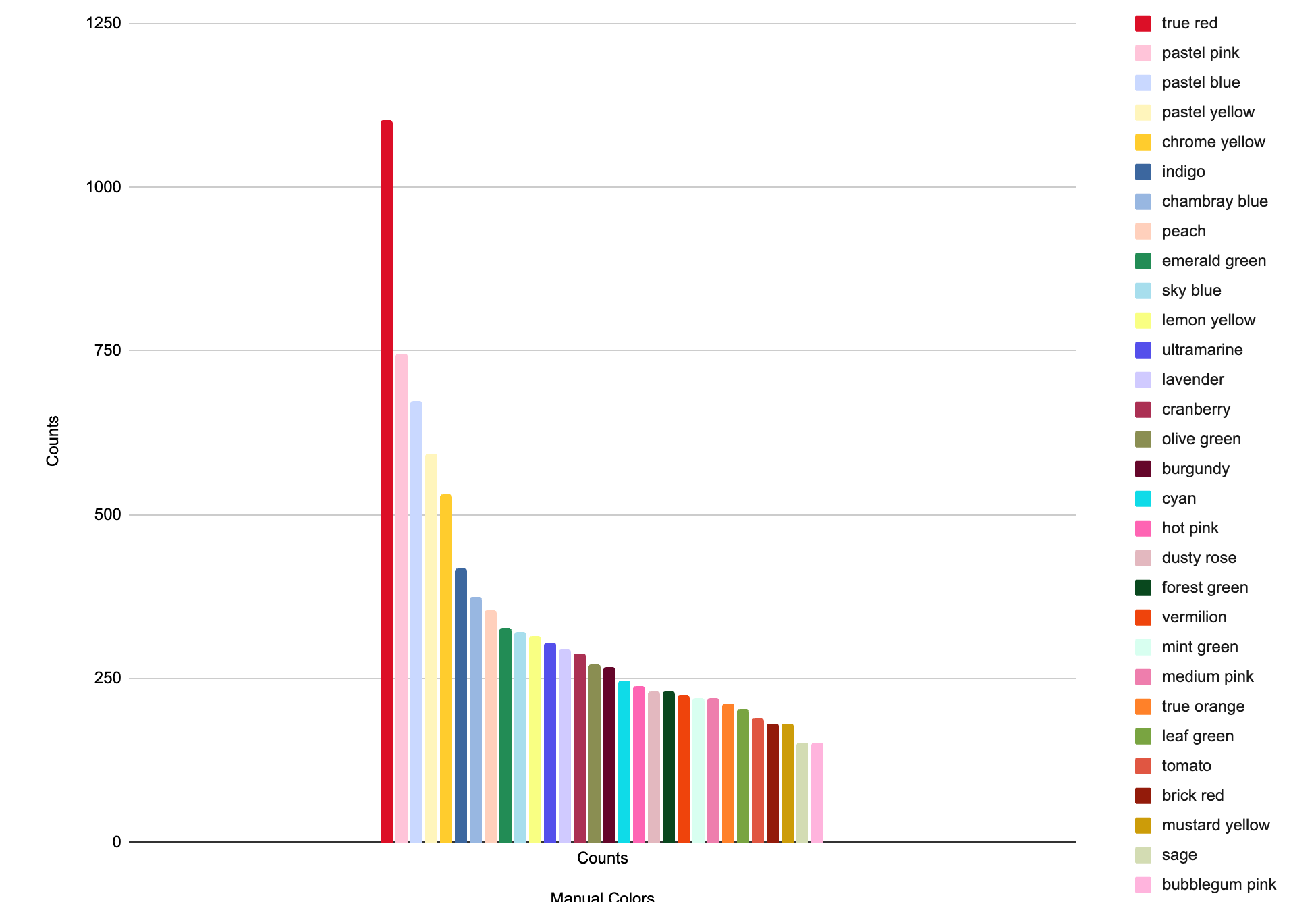 This year I did both manual counts, where I counted how many “looks” a given color (as subjectively determined by me) appeared in, and automated counts, where I asked an LLM (currently GPT-4o) to identify all the colors in the outfit in each image and aggregated the counts across images. I’m using the same code and prompt as I have for the past several years for the automated counts.