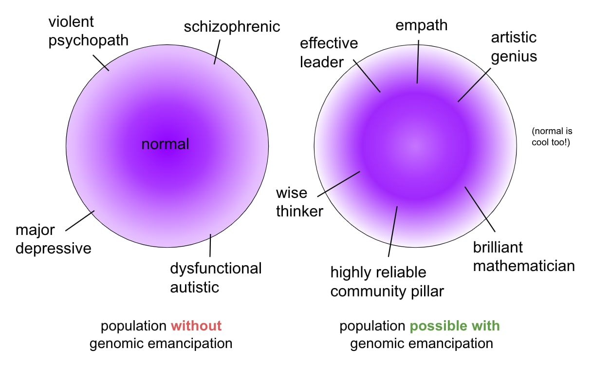 I think that Genomic Emancipation should be broadly beneficial, according to each person's own values. It won't be perfectly universally beneficial: some parents will make genomic choices that really are bad, e.g. they cause their children to suffer, so that the children later say "This should not have been done, or even allowed.". But I think it would be very broadly very beneficial, and should therefore be broadly agreeable and motivating.