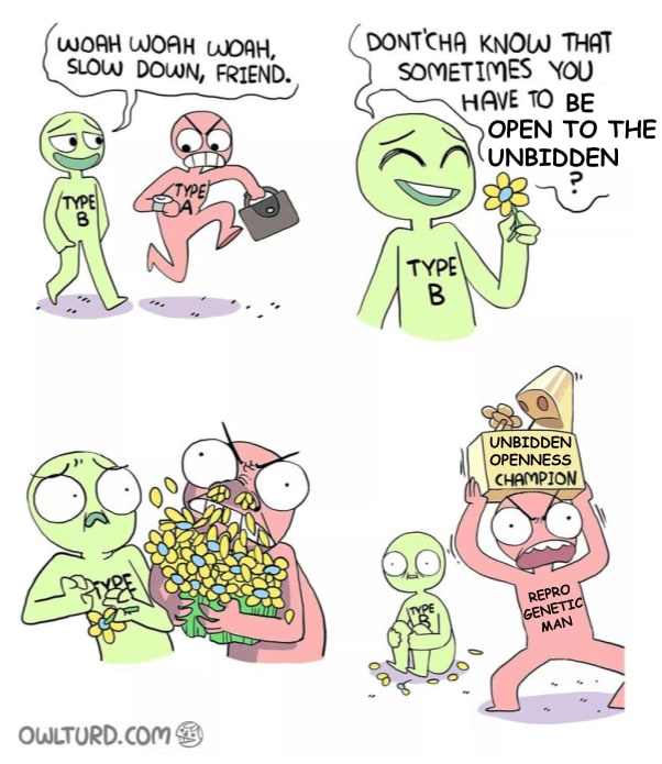 However, this picture isn't silent on the question of moral genomic choices. It says that parents must choose on the basis of their care for their child. Parents ought not to choose based on whims. E.g., if some artist is popular this year, and that artist has noticeably uncommonly high openness, and the parents try to imitate that by choosing for their child to be high openness in expectation—that is an impoverished and immoral motivation. Parents choosing based on whims aren't doing their version of caring for their child; they are failing their child, and compromising their child's autonomy; they're failing humanity's long-term project to compute moral genomic choices; and they're failing to participate in the transpersonal being extending through them and centered in their child (the family spirits, you could say).