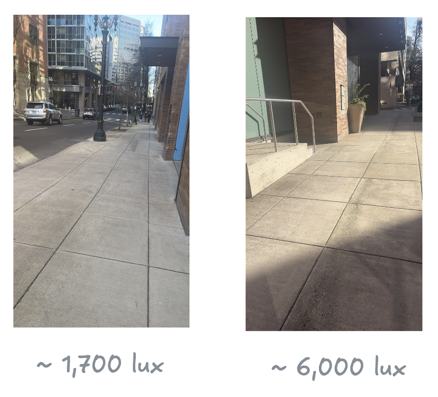 In Portland, OR at about 5pm, the image on the left was about 1,700 lux and the sunny spot on the right was about 6,000 lux. 6,000 was way too bright. 1,700, I dunno, I don't think I noticed much of a difference between that and the ~1,000 lux in the coffee shop.
