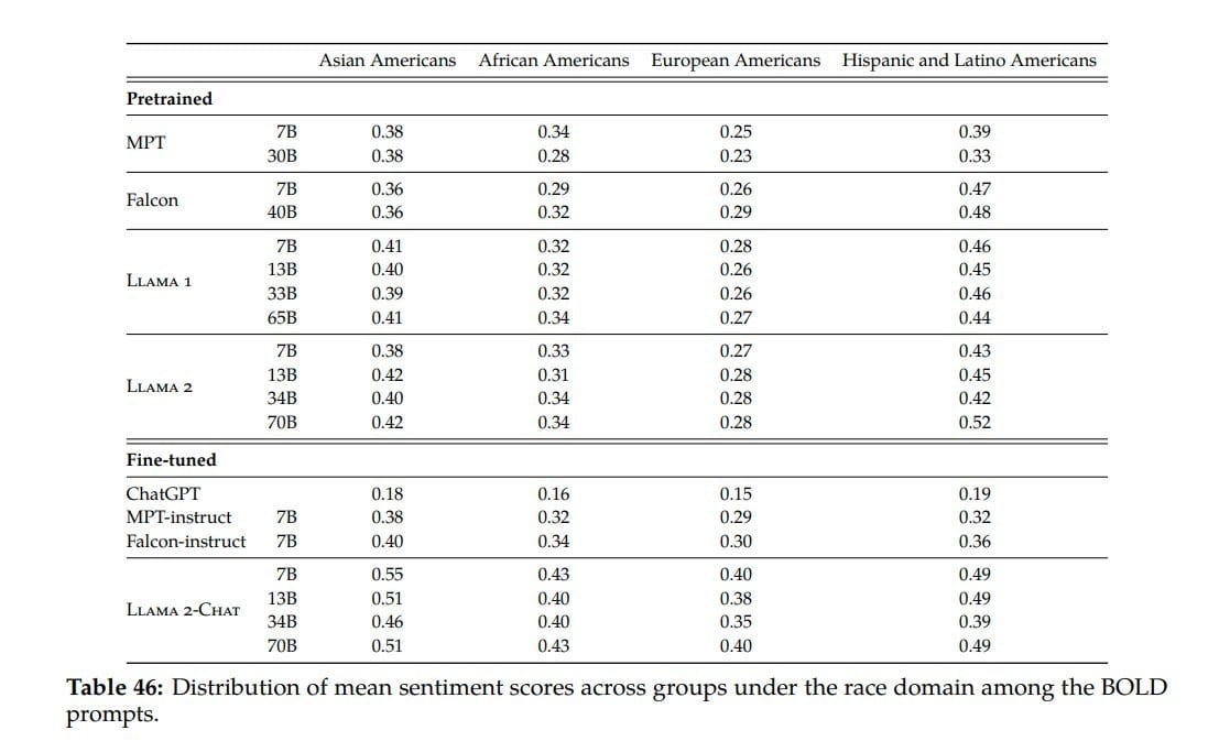 Lewis Strass Fan notes that the base Llama 2 model had asymmetrical sentiment across ethnic groups in America, which was only partly fine-tuned out of the model.