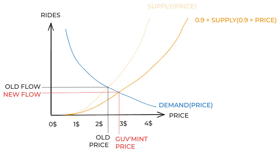If the government mandates a price of P and drivers spend a fraction U of their time waiting around, and you account for both of the above effects, the actual number of rides supplied will be U×SUPPLY(U×P). (Through the logic in the above example.)