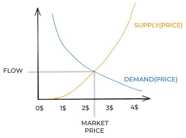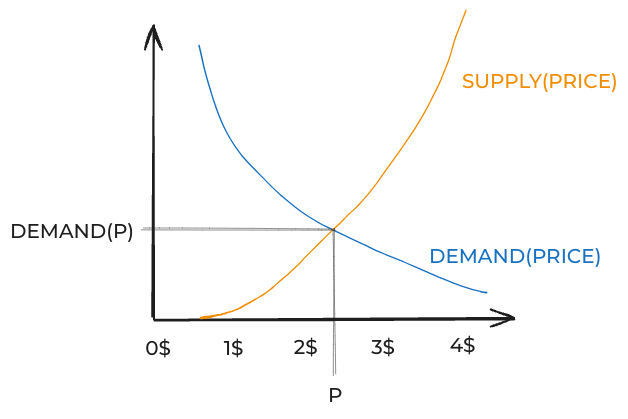 In a free market, prices will—under some not-too-crazy assumptions—eventually settle at whatever price makes these curves intersect.