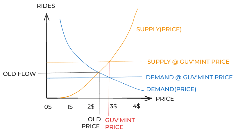 Ordinarily, what would happen in this situation is prices would go down. This would cause drivers to drive a bit less and riders to ride a bit more and this would continue until the price went back to the market price. But that can’t happen when the price is fixed. So what happens instead?