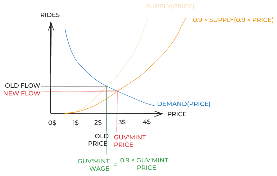 In this section, I’ll prove that that when the government increases prices, the absolute best that drivers can hope for is that 50% of the extra money shows up in wages. For example, if the market price is $20/ride (and the market wage $30/hr) and the government increases the price to $30/ride, then the highest possible new wage is $25/hr. And probably less.
