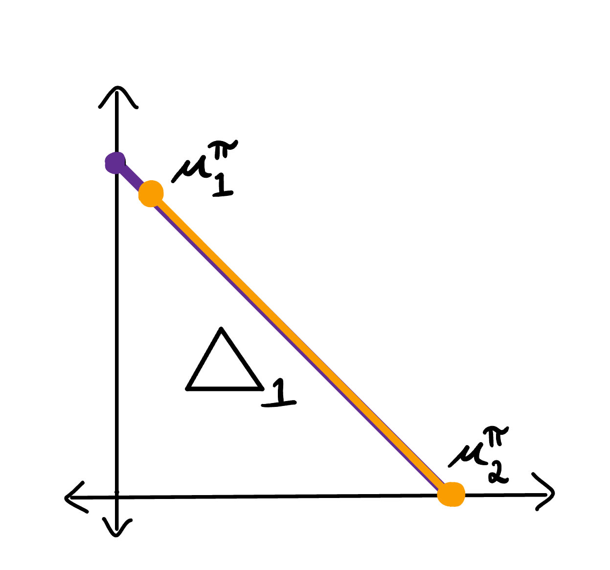 By disregarding the last two irrelevant coordinates, we can visualize and as points in the 1-dimensional simplex. Let be the convex closure of . Then corresponds to a line segment on the 1-dimensional simplex as shown in Figure 4.