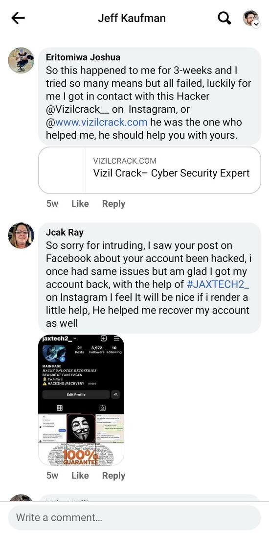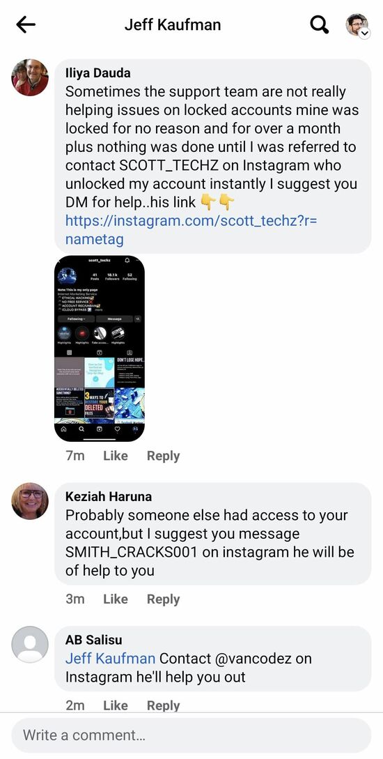It sounds like there's a business in helping (or scamming) people who've had their Facebook/Instagram accounts hacked?