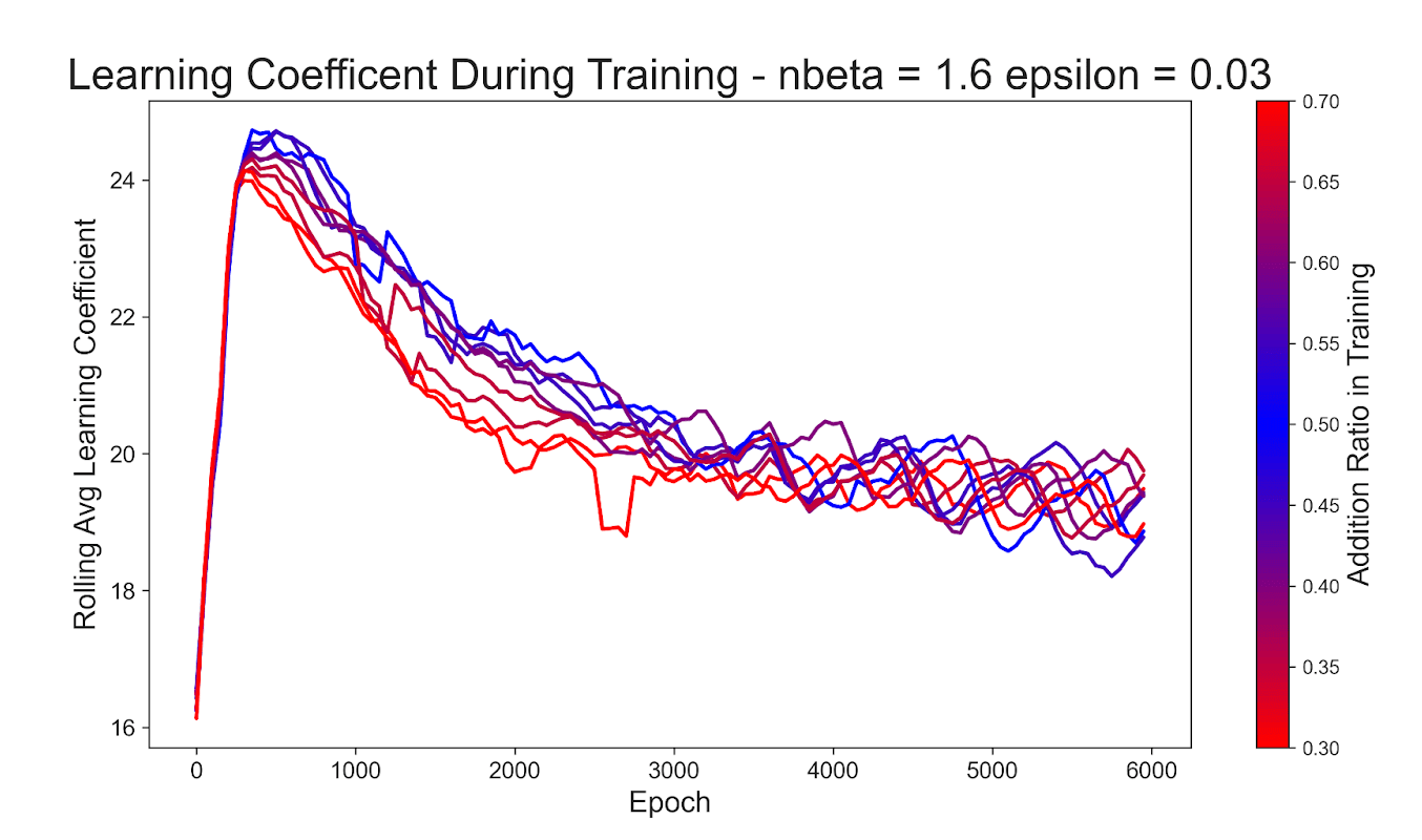 The models exhibited unique grokking patterns for addition and multiplication operations. These patterns varied significantly based on the proportion of addition to multiplication problems in the training data. When the ratio of problem types was more uneven, the local learning coefficient (LLC) began to decline earlier in the training process. This earlier decline in LLC mirrored the faster grokking behavior seen in the loss curves for the dominant problem type. However, despite these timing differences, the overall shape of the LLC curve remained similar across all ratios tested. Importantly, the LLC curves did not reveal separate, distinct stages for learning addition versus multiplication, contrary to the initial hypothesis.