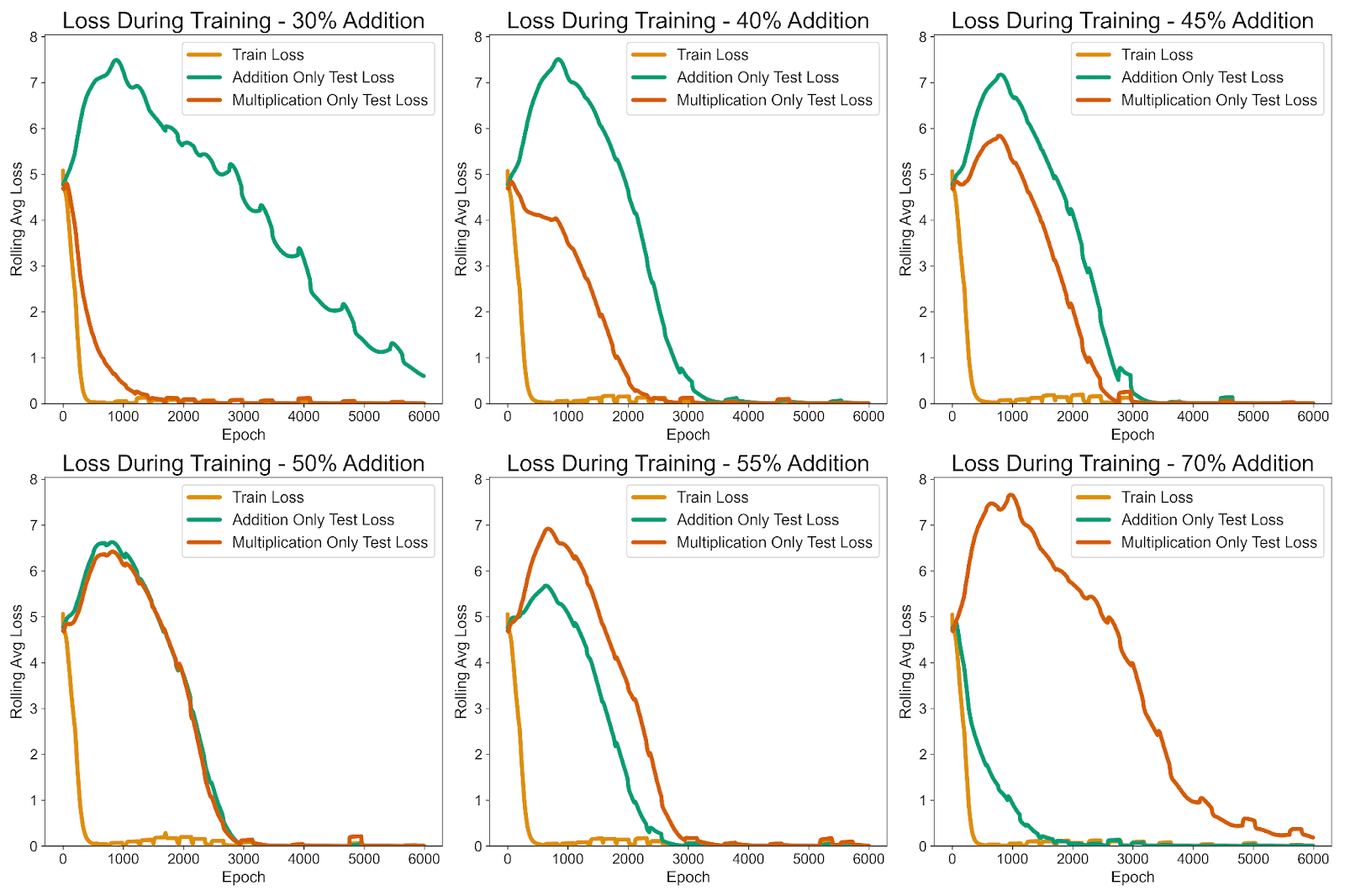 The above graphs show the model being trained with between 30% to 70% of the training data being addition problems. I separated the test data into addition only test and multiplication only test sets so we could see how the model groks each problem type separately. From these loss curves we can see that the model shows separate grokking behavior depending on the proportion of problem types in the training data.