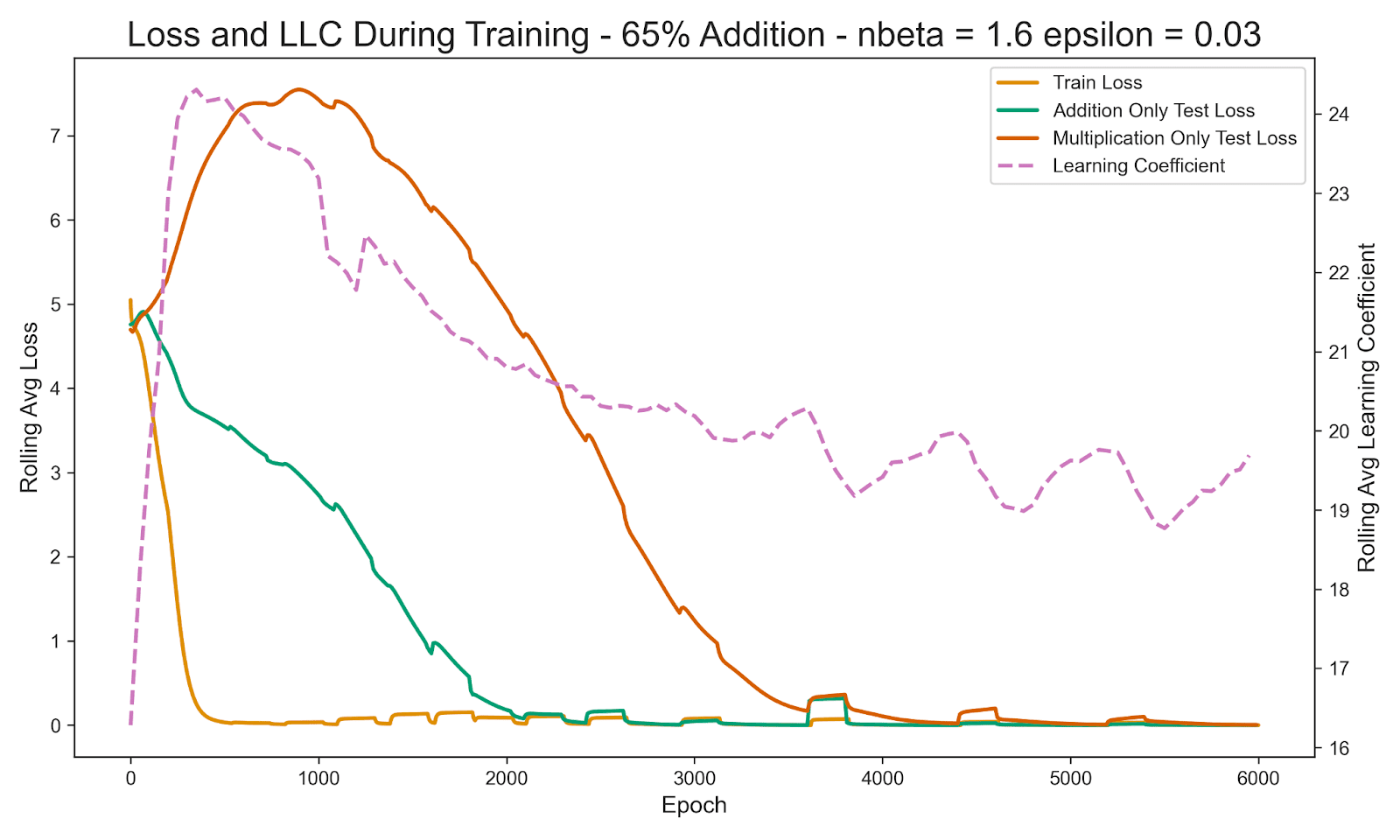 I measured the local learning coefficient during training for each ratio of problem types. Above you can see the LLC measured during training when the training data was 65% addition. We see a rapid increase as the model overfits to the training data and then a decline in the LLC as it generalizes both addition and multiplication. This shows a phase transition in the model from the peak of the LLC curve to the when it stops declining and has generalized.
