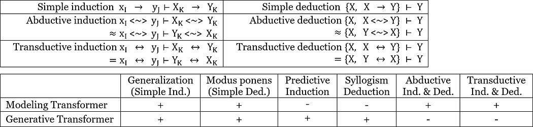 Artificial neural networks in the ideal case implement the deductive Modus ponens: “{X, X → Y} ⊨ Y”— taking an input X, they output Y. And the causal attention mechanism of the generative transformer additionally implements another type of deduction — the syllogism: