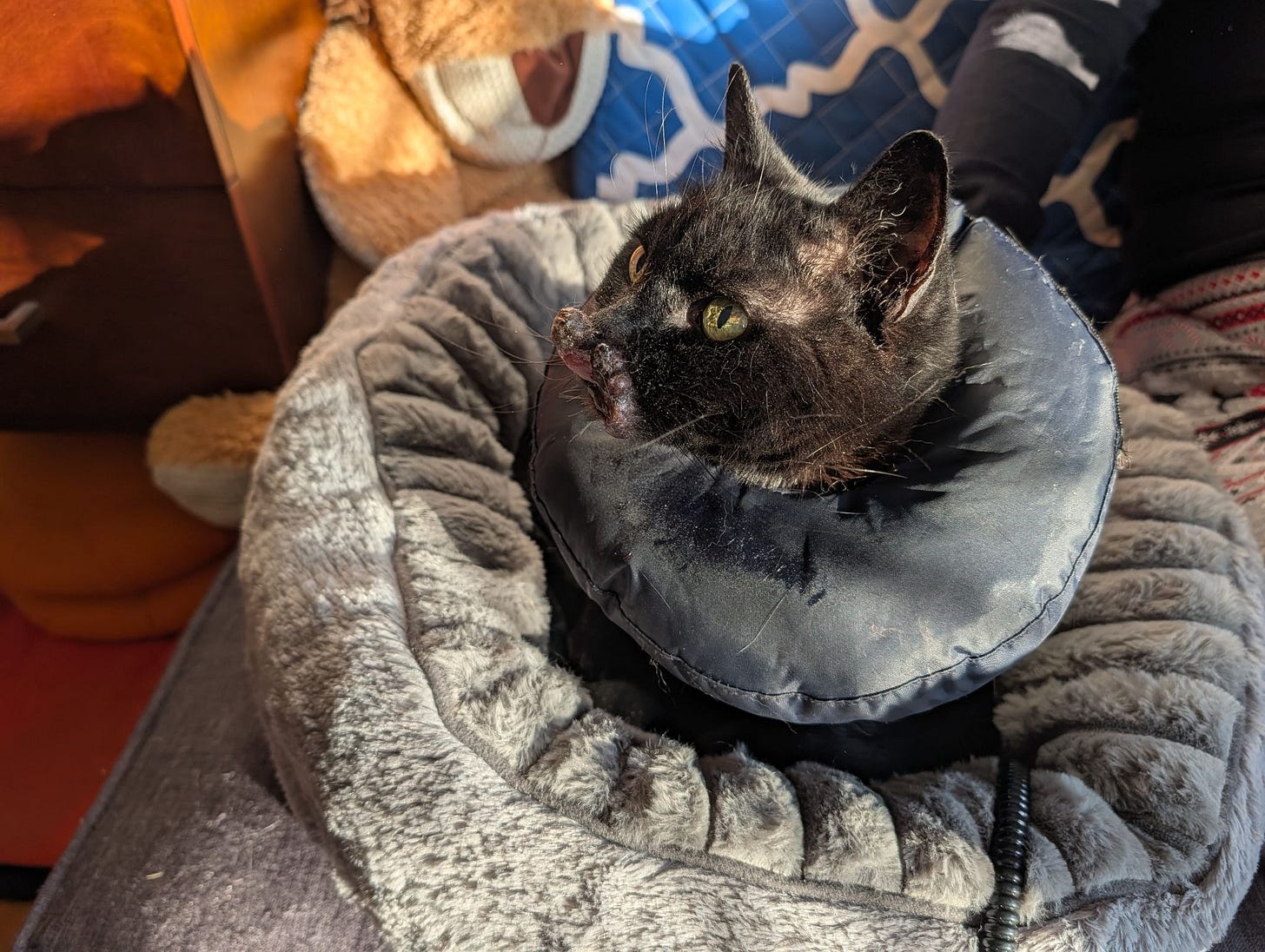 But we couldn’t feed her enough that way, and she was losing weight. The tumor was getting larger and soon would spread into her bones. Although she was always happy to cuddle, in the last week she spent most of her hours curled up in a heated bed, tolerating a pain she had no way to avoid.
