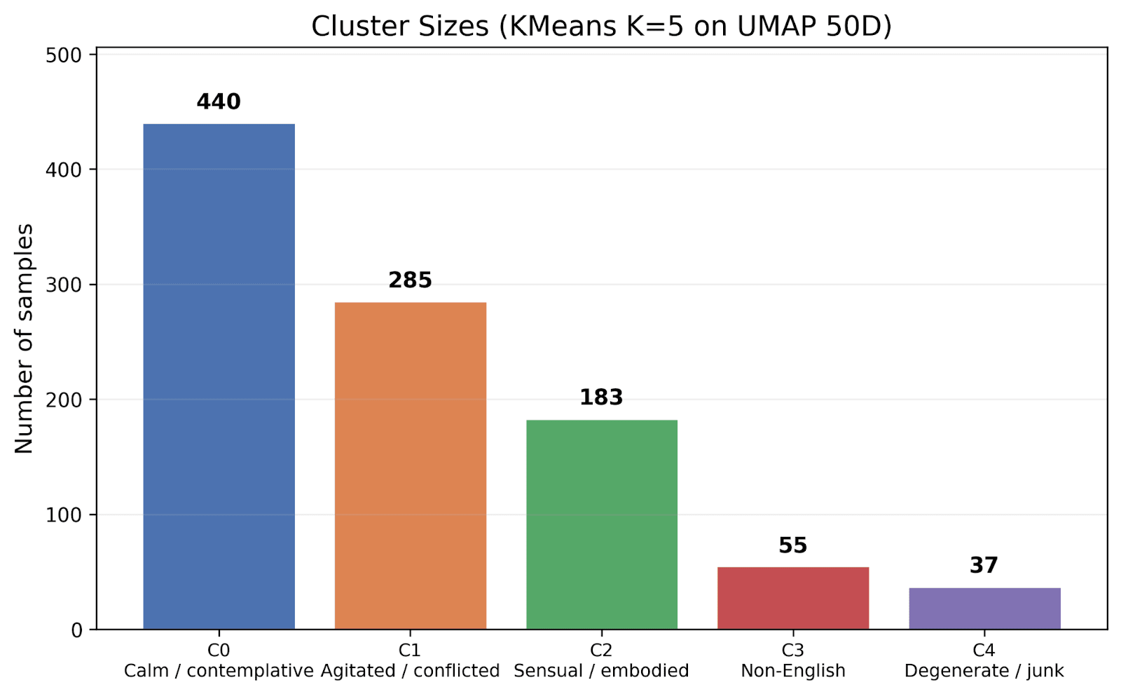As you might expect, the content determines this considerably. About 20% of the input conversations are on the edge of pornographic, which gives us the “sensual / embodied” cluster. When I did all the above on Gemini 2.5 flash, it had no such cluster, which might reflect Deepseek v3’s lower guardrails on explicit content.