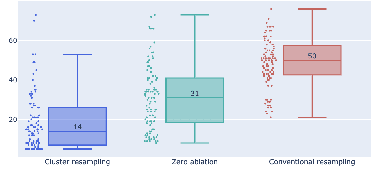 As a result of using cluster resampling, the circuits we extract include fewer features than those extracted using conventional ablation methods. In the following experiment, we compare the number of features in circuits extracted using a zero ablation, resample ablation, and cluster resample ablation. We use random prompts from the validation dataset and generate circuits with a target KL divergence threshold of 0.25. Because our model activations embed a large amount of positional information (reviewed in the next section), conventional methods tend to produce poor circuits on lengthier sequences. To not unfairly advantage our method we limit this experiment to short sequences with exactly three tokens.