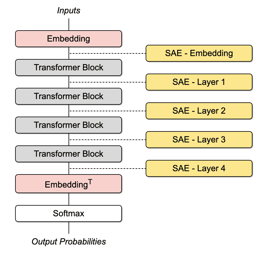 We use a small character-based LLM trained on the Tiny Shakespeare dataset. Our model follows the GPT-2 architecture, with 4 layers and an embedding dimension of 64. We train end-to-end JumpReLU SAEs after every residual stream layer, and on the embeddings. For each layer, we’re able to achieve a downstream cross-entropy loss increase of under 0.05 at a sparsity of L0 ≈ 10. Our code is available here.