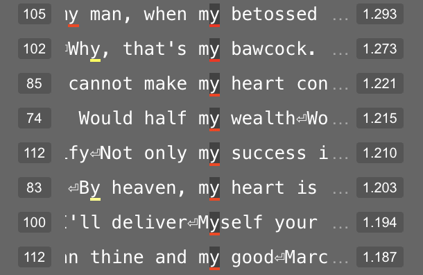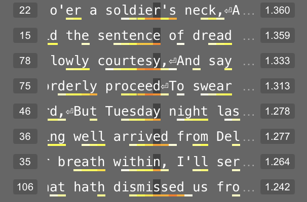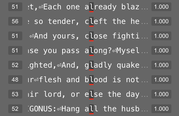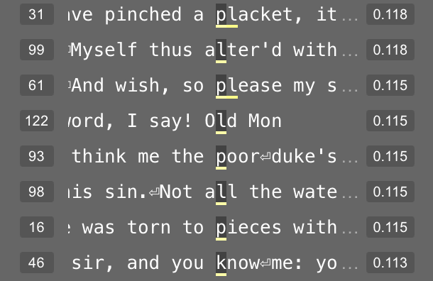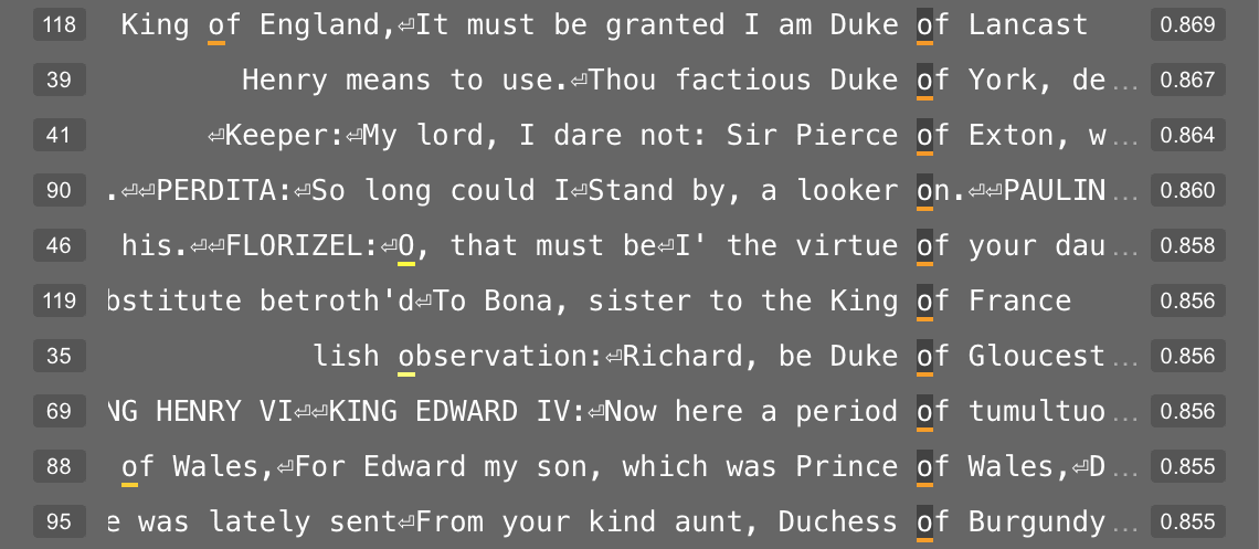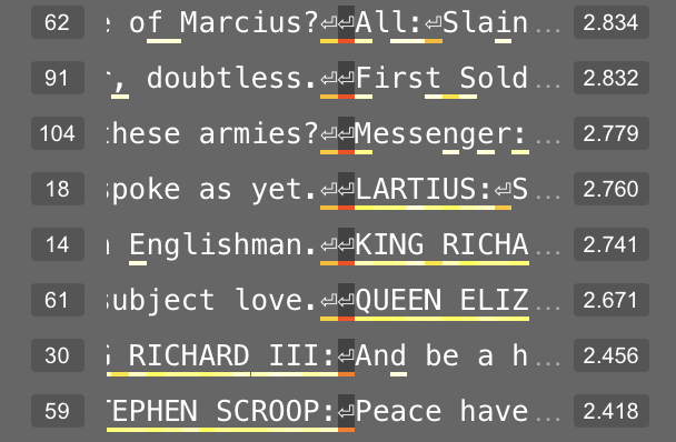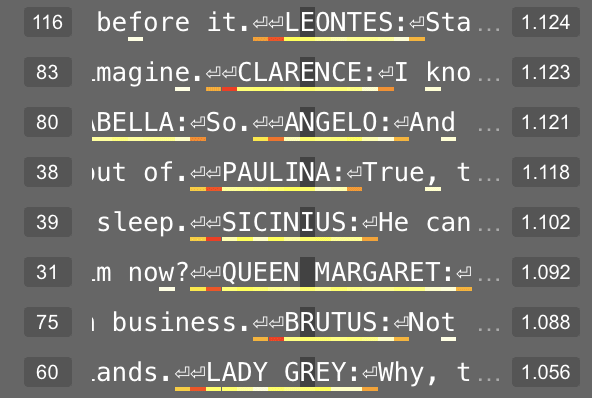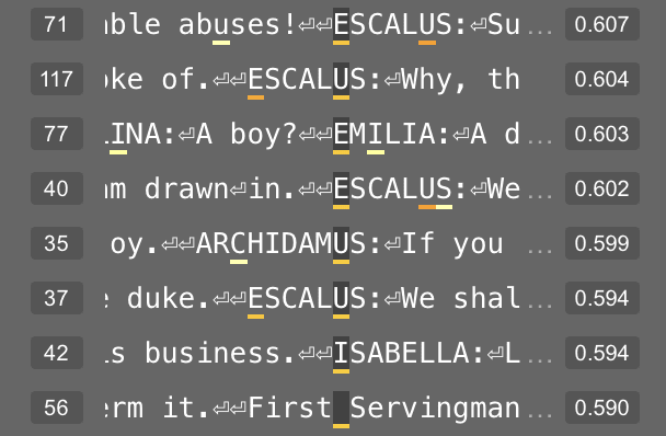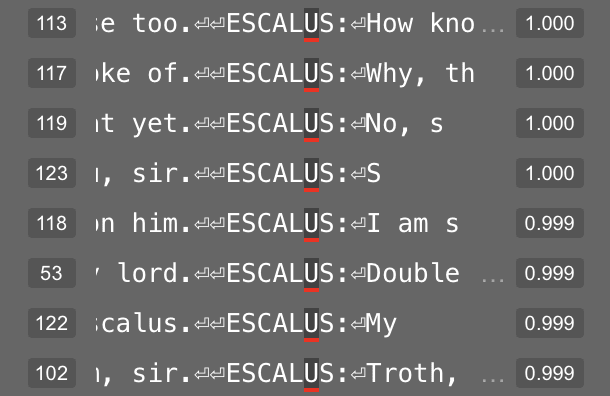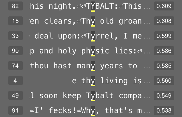 Feature 181 in layer 4 appears related to the letters in a character’s name. At its 95th percentile value, this feature usually represents the double-line break before the character’s name. But at its 50th percentile value, this feature fires on letters within a character’s name.