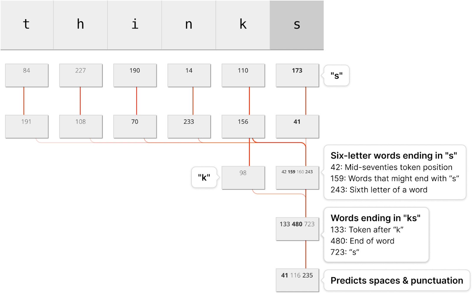 Predicting a space character after the letters in “thinks”