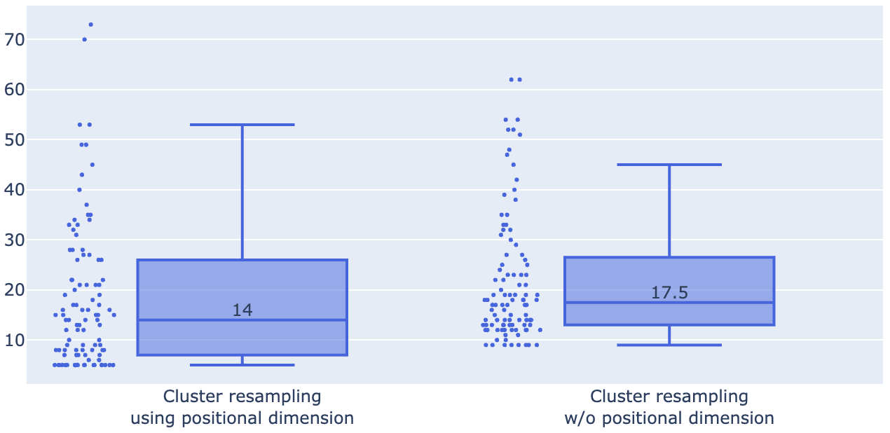 To test the effectiveness of incorporating positional information, we repeat our prior experiment and include a variation on cluster resampling that omits use of this added positional dimension. On average, the circuits extracted through use of this added dimension include about 4 fewer features. Qualitatively, we’ve seen that this effect intensifies with sequence length.