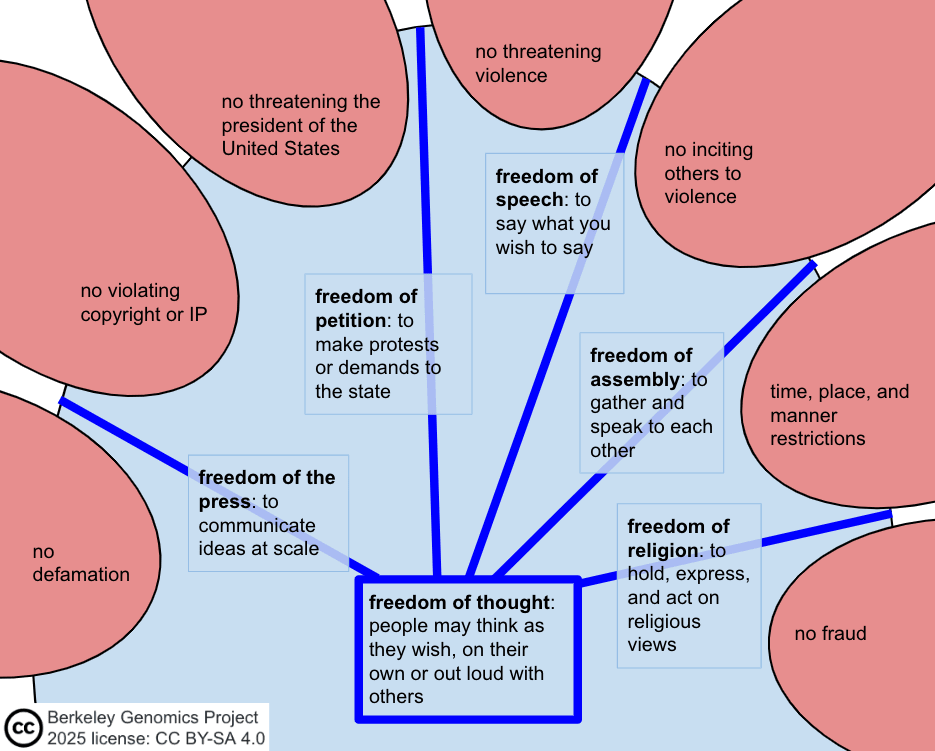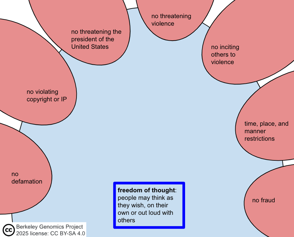 Here's a schematic depicting this situation. The light blue oval is freedom of thought, which is protected under the First Amendment. The red ovals are some of the exceptions to freedom of thought.