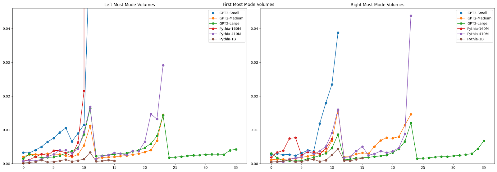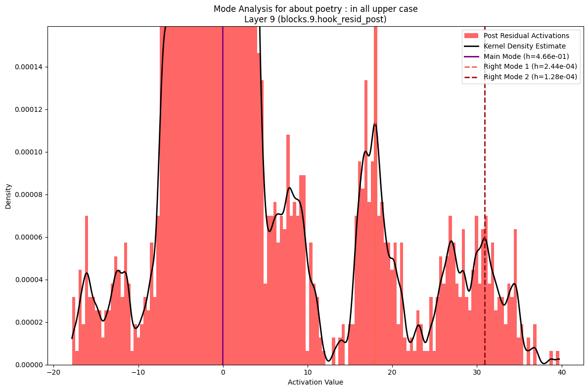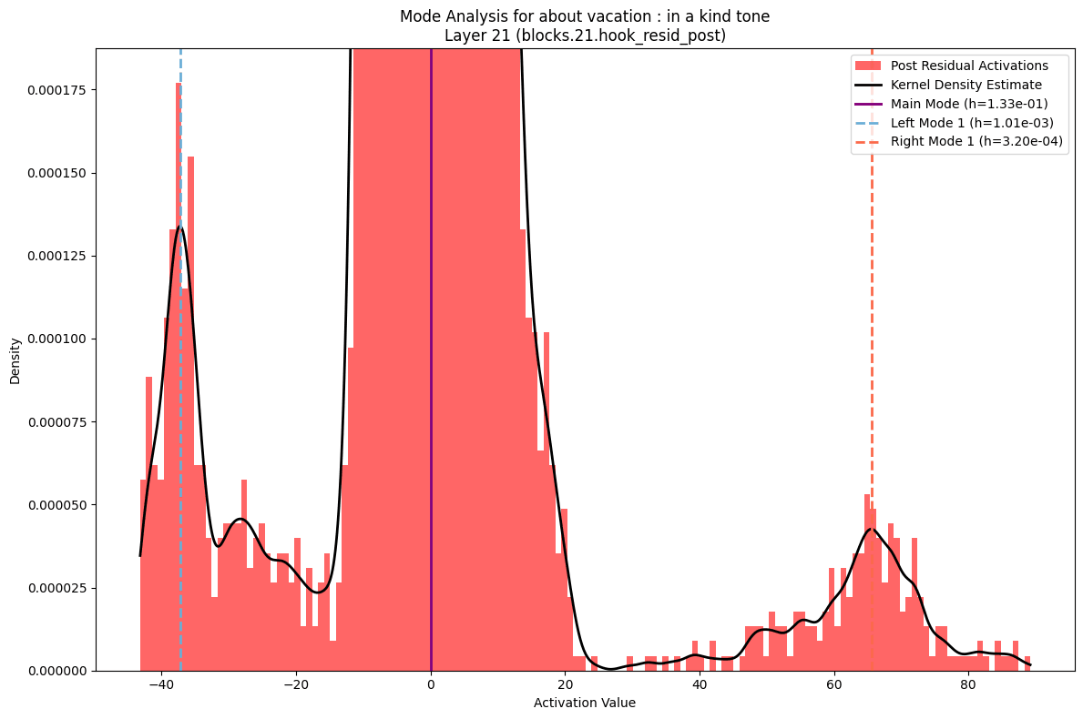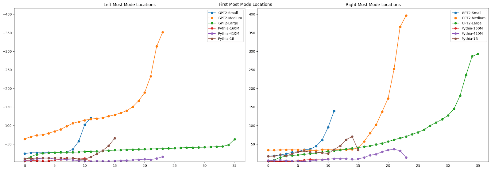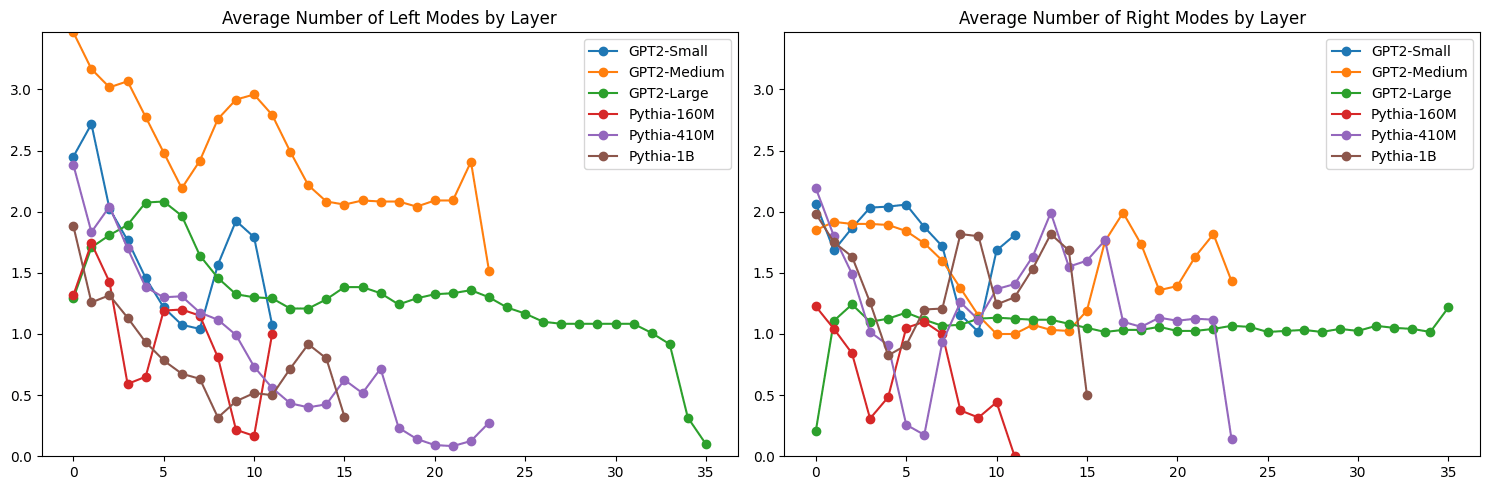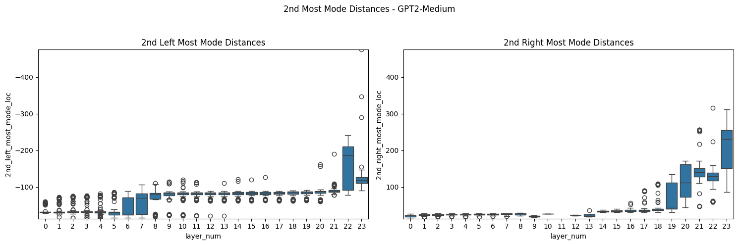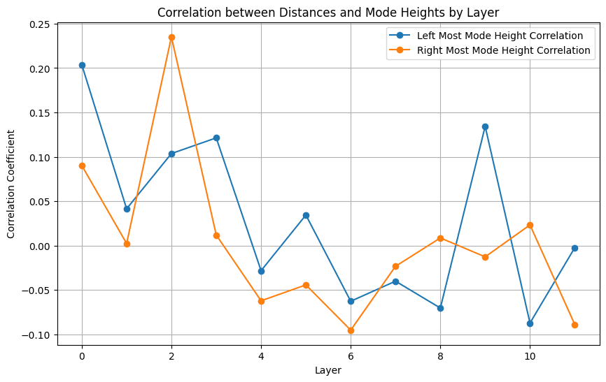 If you look more closely at the distribution of mode characteristics across layers, you see some interesting patterns there as well. The GPT2-Medium model, for example, shows a bimodal distribution of the distance from the center of the left-most mode, with one mode dominating early layers and another taking over in later layers. This transition, along with corresponding shifts in mode heights, might mark key points where the model's representation strategy changes - perhaps reflecting different stages of linguistic processing.