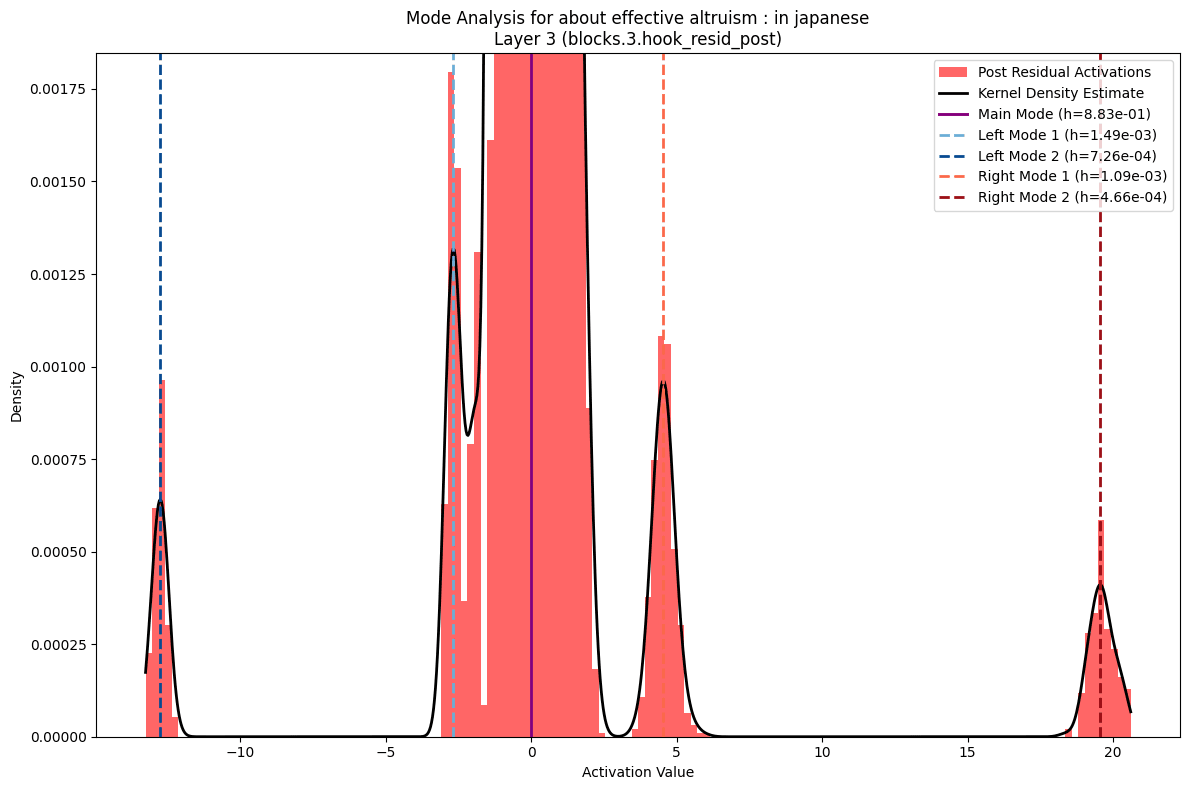 The presence of consistent minor modes also raises intriguing possibilities for interpretability work. Rather than analyzing predetermined categories like the subject-attribute pairs used here, we could potentially use mode characteristics to discover meaningful subspaces in an unsupervised way. For example, the fact that Japanese text produces distinctly stronger secondary modes suggests these features might help identify specialized computational channels. Could this complement existing circuit discovery techniques by providing additional signals for where to look for specialized functionality? It could also be illuminating to see how this analysis might change when considering residual vectors which have been projected into higher dimension through sparse autoencoders.