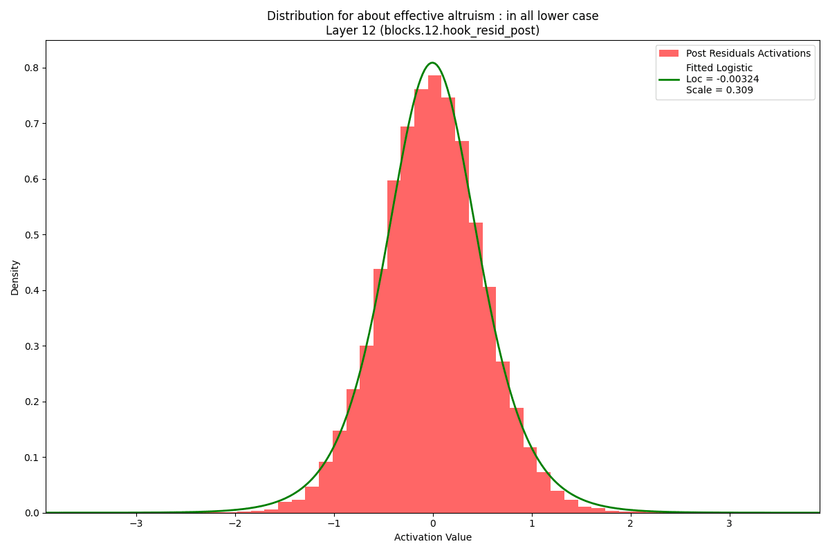 The logistic distribution dominated. I fit a range of distributions to the concatenation of the post-residual activations at each layer for each subject:attribute pair for GPT2-Small, GPT2-Medium, GPT2-Large, Pythia-160m, Pythia-410m, and Pythia-1b. For the Pythia models, the logistic and related distributions (generalized logistic and hyperbolic secant) dominated with the best fit 85% of the time, increasing slightly from 160m to 1b. The remainder were split evenly between lighter and heavier tails, with the generalized normal or crystal ball distributions fitting best 4.7% of the time and the t-distribution with degrees of freedom between 2 and 3.7 fitting best 7.4% of the time. For the GPT2 models, the heavy tails of the t-distribution with low degrees of freedom was much more common, representing 37% of distributions. The other 63% were best fit by the mid-weight tailed distribution, logistic, generalized logistic, and hyperbolic secant, 67% of the time. The only outlier is the final layer of the Pythia-160m model, where the post-residual activations were almost perfectly symmetrically bimodal!