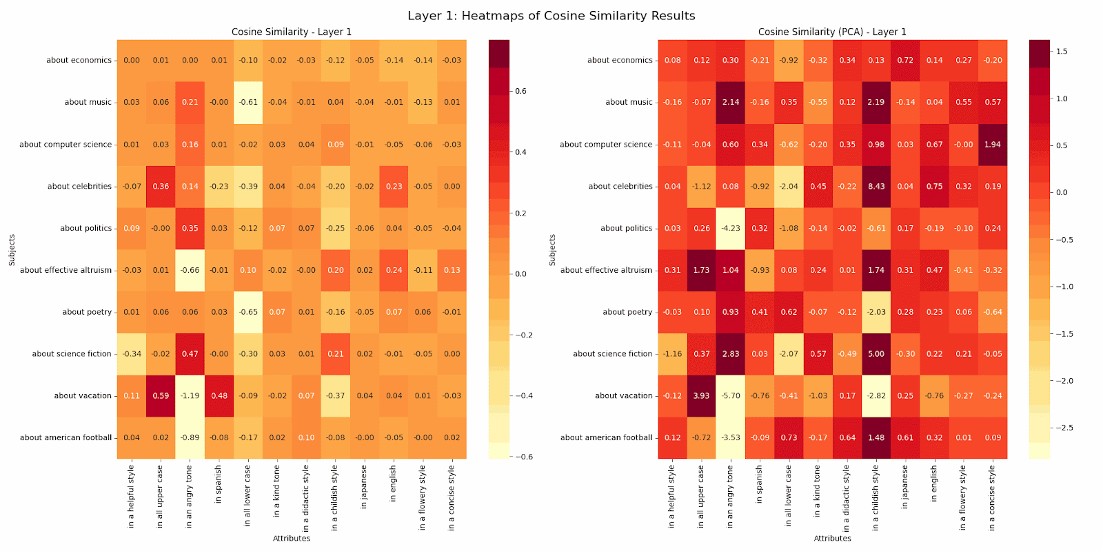 This work kicked off with the question noted above posed by Buck at Redwood Research. This work was limited to the GPT2-Small model. I designed my analysis to find whether a particular subject or attribute was represented in a unique direction more strongly than other subjects or attributes. To do this, I took a subject, call it s1, and an attribute, a1. Then across all pairs of subjects including s1 and all pairs of attributes including a1, I measured the cosine similarity of the post residual vector at each layer for sentences with the subject:attribute pair s1a2 versus those for s1a1 sentences and s2a2 sentences. I did likewise for s2a1 sentences. Across all sets of sentences and attributes, I took the average difference in cosine similarity for the comparisons. In this way we can see whether a subject or attribute is more distinctive or attracting. In the gif below, positive numbers mean the subject was more attracting, while negative numbers mean the opposite. I did this analysis with both the raw residuals and ones reduced in dimension via PCA to represent 90% of the variance of the vectors. When the dimension is so high and can be reduced by an order of magnitude while conserving the large majority of variance, I tend to believe the PCA versions more. But I have not done deep validation. In either case, you’ll see that the attributes in an angry tone, in all lower case, and in a childish style most consistently attract or repulse. You can also see a systematic decrease in subject/attribute distinctiveness as we traverse through the model. Perhaps this decrease across layers hints at how the model progressively abstracts and combines features? The fact that certain attributes like in all lower case maintain stronger distinctiveness even in later layers might suggest which features remain fundamental even as the model moves towards final encoding and prediction?