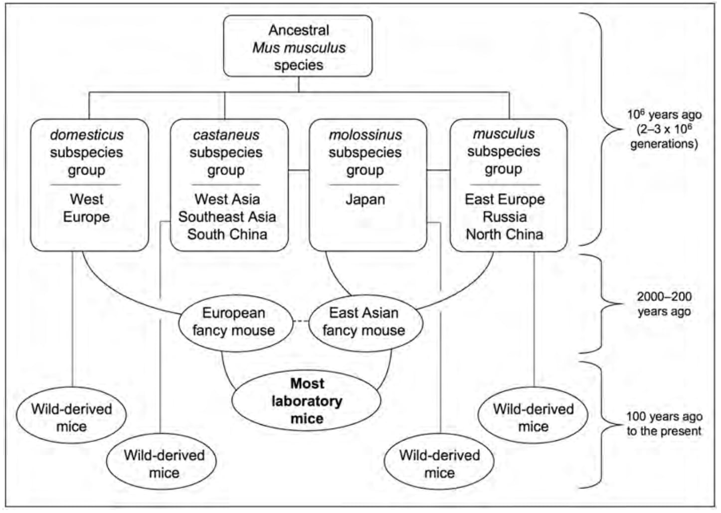 Origins of mice used in research. Image Credit: JAX Handbook. Adapted from Yoshiki and Moriwaki (2006).