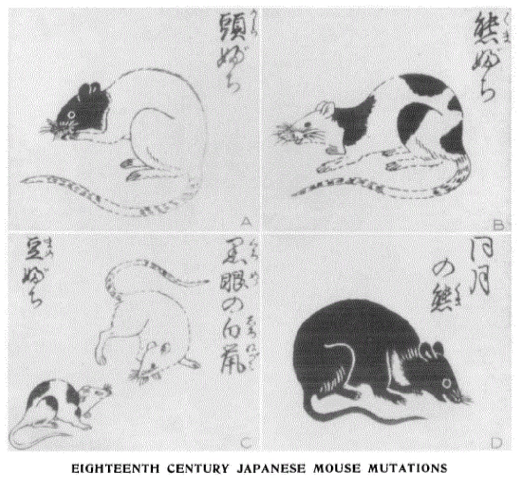 Long before mice were bred for biological research, mice fanciers had established a process for breeding mice in captivity. This image is from the frontispiece of a 1787 Japanese handbook, "Chin-gan-sodategusa" ("The breeding of curious varieties of the mouse"), which profiles fancy varieties and offers tips for breeding mice of desired coat colors. Credit: American Genetic Association, 1935.