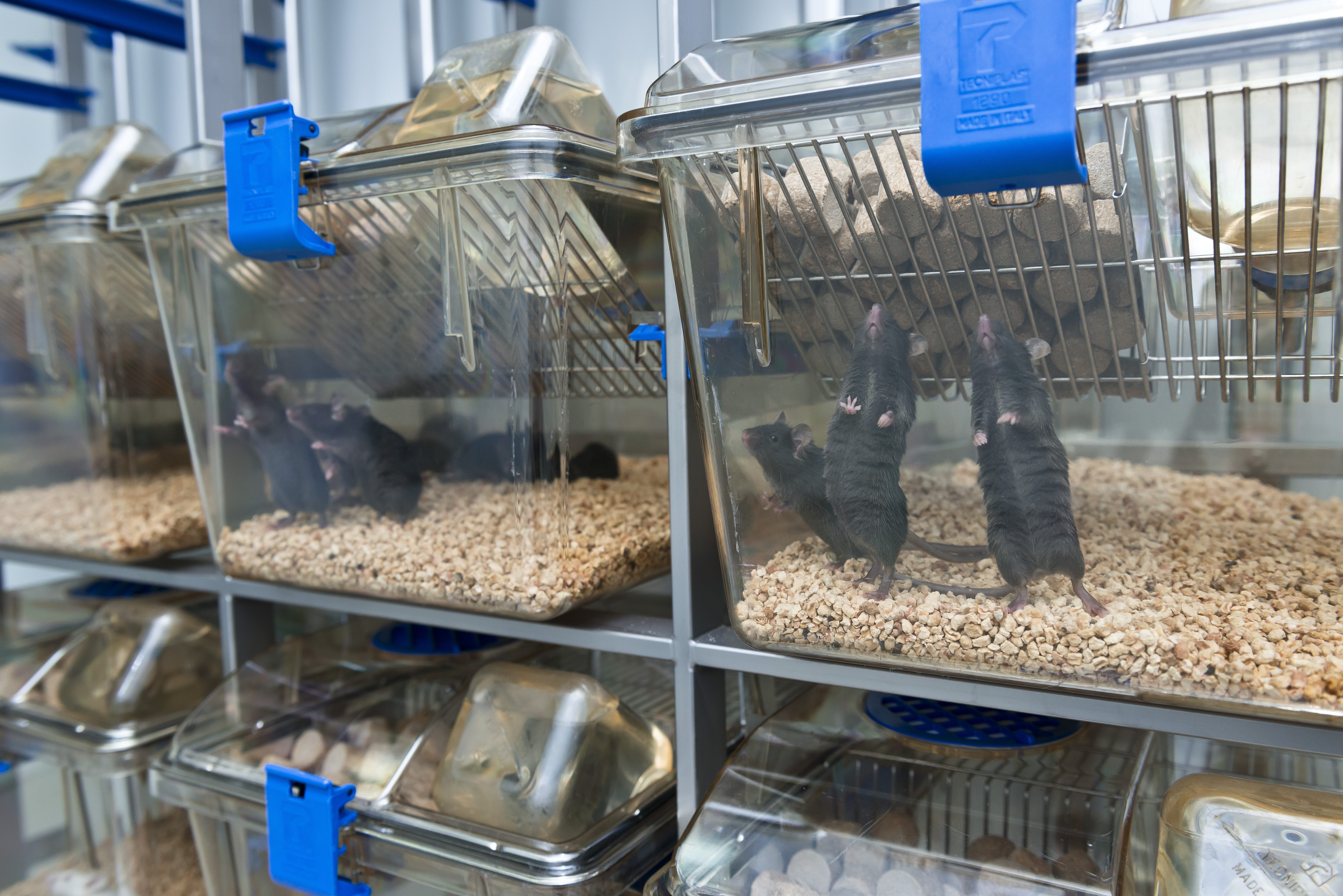 C57Bl/6 mice in laboratory cages.