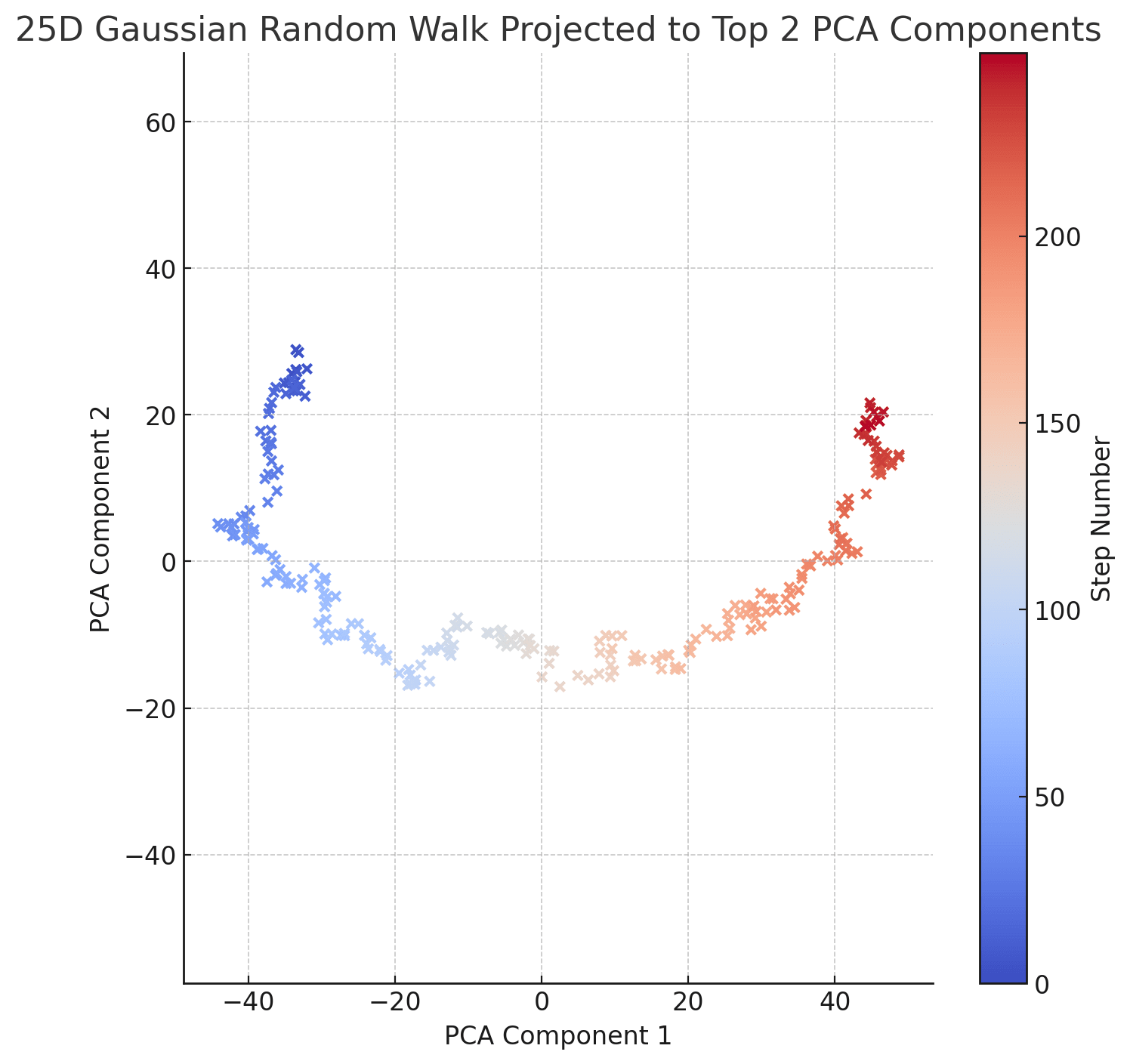 This is fun! Let's do the same thing with 250 points of a 25-dimensional random walk, plotted to their top 2 PCA: