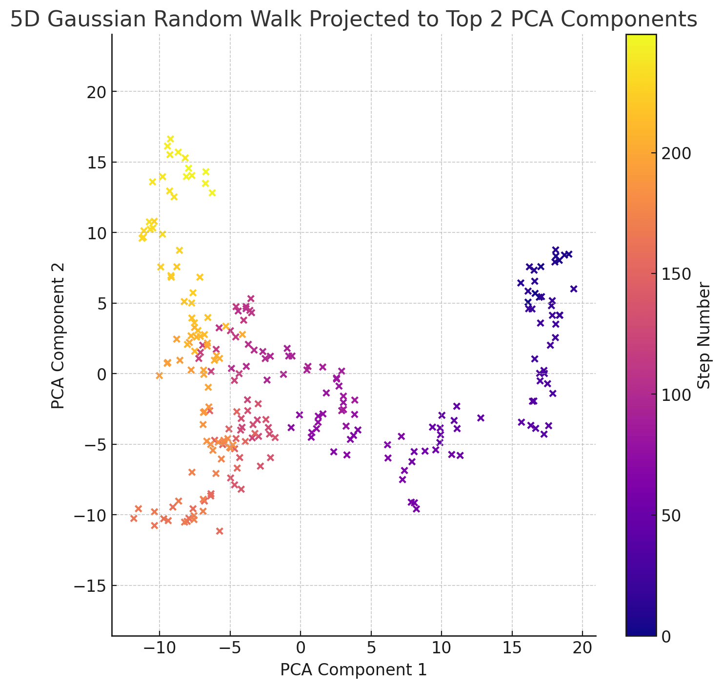 So if the top PCA components of a process with memory look like a random walk, that's even stronger evidence that we haven't found a pattern (at least a linear one). Here is a 5-dimensional random walk plotted to 2 dimensions via its top 2 PCA components: