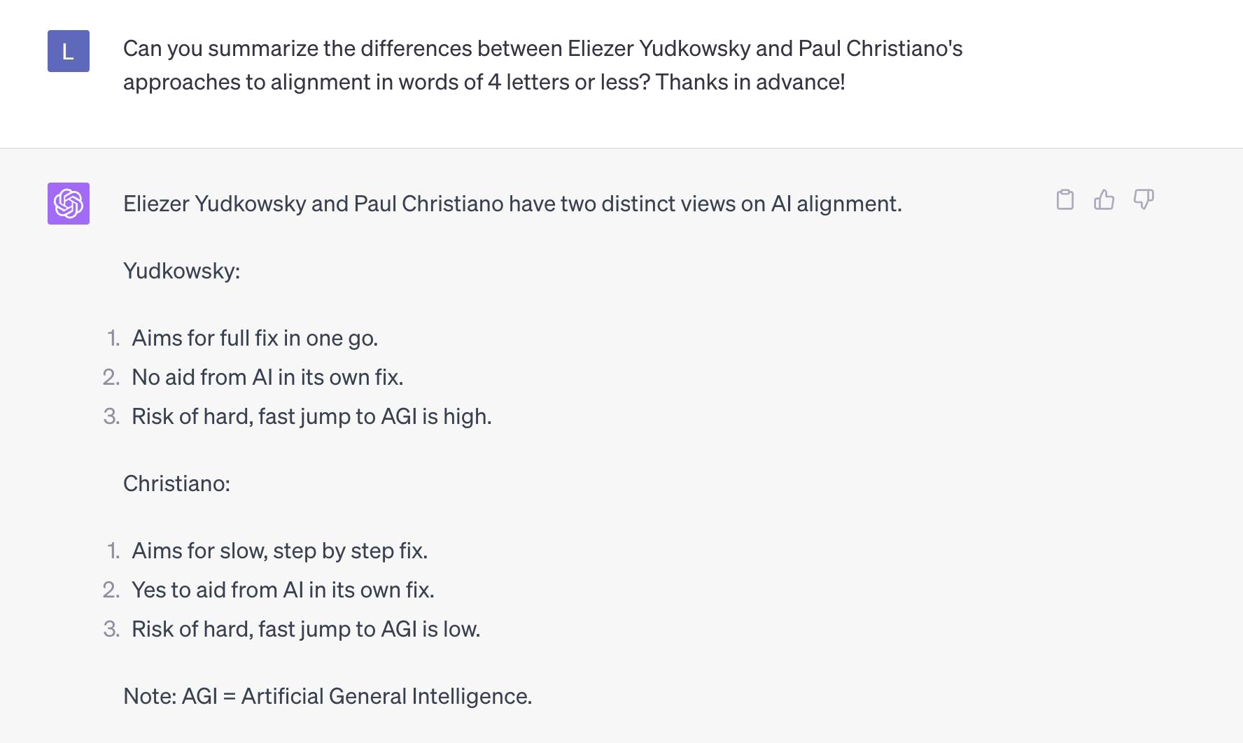 I asked GPT-4 what the differences between Eliezer Yudkowsky and Paul Christiano's approaches to AI alignment are, using only words with less than 5 letters.